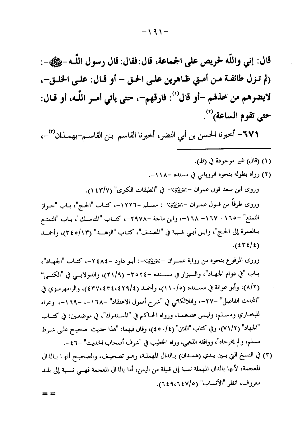 قَالَ إِنِّي وَاللَّهِ لَحَرِيصٌ عَلَى الْجَمَاعَةِ قَالَ فَقَالَ قَالَ رَسُولُ اللَّهِ صَلَّى اللَّهُ عَلَيْهِ وَسَلَّمَ (لَمْ تَزَلْ طَائِفَةٌ مِنْ أُمَّتِي ظَاهِرِينَ عَلَى الْحَقِّ أَوْ قَالَ على الْخلق لايضرهم مَنْ خَذَلَهُمْ أَوْ قَالَ فَارَقَهُمْ حتَّى يَأْتِيَ أَمْرُ اللَّهِ أَوْ قَالَ حَتَّى تقوم السَّاعَة) // رَوَاهُ بِطُولِهِ بِنَحْوِهِ الرَّوْيَانِيّ فِي مُسْنده