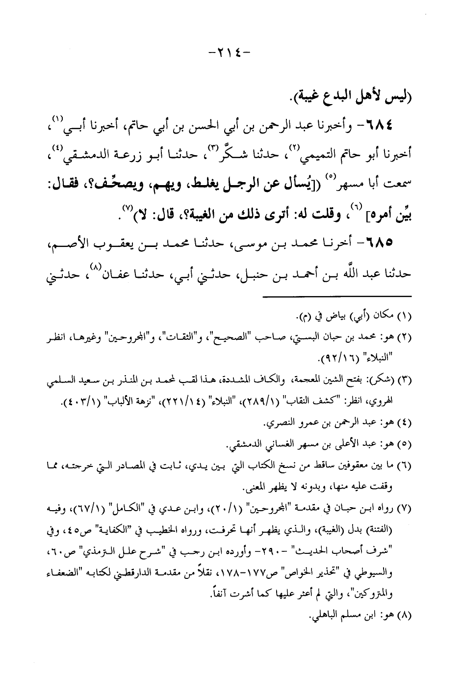 684 - وَأَخْبَرَنَا عَبْدُ الرَّحْمَنِ بْنُ أَبِي الْحَسَنِ بْنِ أَبِي حَاتِمٍ أَخْبَرَنَا أَبِي أَخْبَرَنَا أَبُو حَاتِمٍ التَّمِيمِيُّ حَدَّثَنَا شكّرُ حَدَّثَنَا أَبُو زُرْعَةَ الدِّمَشْقِيُّ سَمِعْتُ أَبَا مُسْهَرٍ (يُسْأَلُ عَنِ الرجل يغلظ وَيَهِمْ وَيُصَحِّفُ فَقَالَ بَيِّنْ أَمْرَهُ وَقُلْتُ لَهُ أَتَرَى ذَلِكَ مِنَ الْغَيْبَة قَالَ لَا) // رَوَاهُ ابْن حبَان فِي مُقَدّمَة الْمَجْرُوحين وَابْن عدي فِي الْكَامِل فِي //