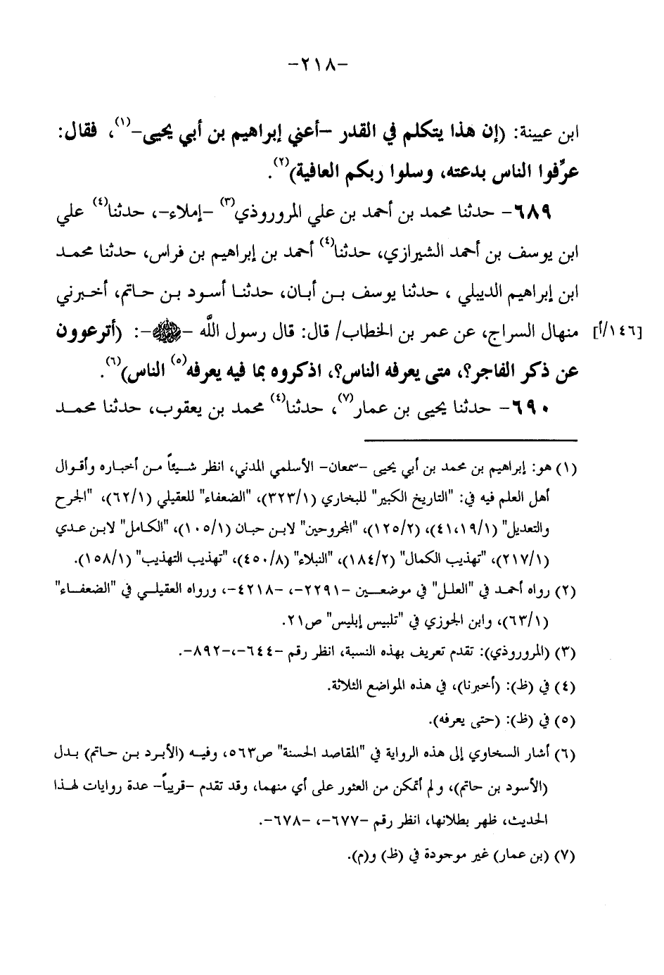 689 - حَدَّثَنَا مُحَمَّدُ بْنُ أَحْمَدَ بْنِ عَلِيٍّ الْمَرْوَرُّوذِيُّ إِمْلَاءً حَدَّثَنَا عَلِيُّ ابْن يُوسُفَ بْنِ أَحْمَدَ الشِّيرَازِيُّ حَدَّثَنَا أَحْمَدُ بْنُ إِبْرَاهِيمَ بْنِ فَرَّاسٍ حَدثنَا مُحَمَّد ابْن إِبْرَاهِيمَ الدَّيْبُلِيُّ حَدَّثَنَا يُوسُفُ بْنُ أَبَانٍ حَدَّثَنَا أَسْوَدُ بْنُ حَاتِمٍ أَخْبَرَنِي مِنْهَالٌ السَّرَّاجُ عَنْ عُمَرَ بْنِ الْخَطَّابِ قَالَ قَالَ رَسُولُ اللَّهِ صَلَّى اللَّهُ عَلَيْهِ وَسَلَّمَ (أَتَرْعَوُونَ عَنْ ذِكْرِ الْفَاجِرِ مَتَى يَعْرِفْهُ النَّاسُ اذْكُرُوهُ بِمَا فِيهِ يعرفهُ النَّاس) // أَشَارَ السخاوي إِلَى هَذِه الرِّوَايَة فِي الْمَقَاصِد الْحَسَنَة وَفِيه الْأَبْرَد بن حَاتِم بدل //