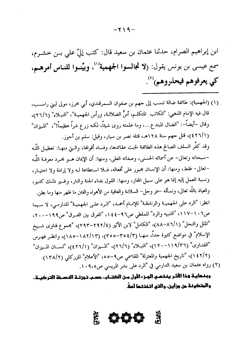ابْن إِبْرَاهِيمَ الصَّرَّامُ حَدَّثَنَا عُثْمَانُ بْنُ سَعِيدٍ قَالَ كَتَبَ إِلَيَّ عَلِيُّ بْنُ خَشْرَمٍ سَمِعَ عِيسَى بْنُ يُونُسَ يَقُولُ (لَا تُجَالِسُوا الْجَهْمِيَّةَ وَبَيِّنُوا لِلنَّاسِ أَمْرَهُمْ كَيْ يَعْرِفُوهُمْ فيحذروهم) // رَوَاهُ عُثْمَان بن سعيد الدَّارمِيّ فِي الرَّد على بشر المريسي //