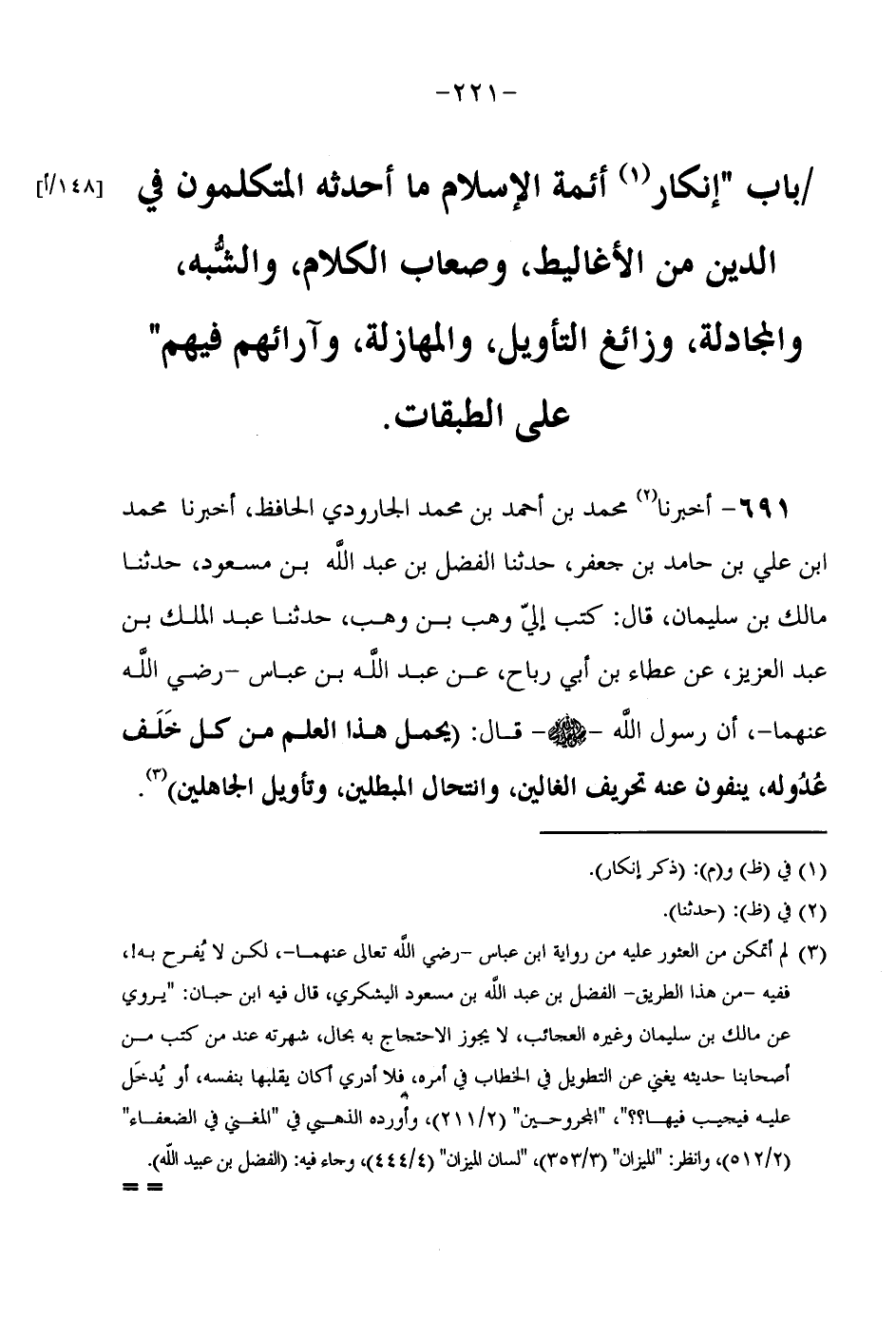 691 - أَخْبَرَنَا مُحَمَّدُ بْنُ أَحْمَدَ بْنِ مُحَمَّدِ الْجَارُودِيُّ الْحَافِظُ أخبرنَا مُحَمَّد ابْن عَلِيِّ بْنِ حَامِدِ بْنِ جَعْفَرٍ حَدَّثَنَا الْفَضْلُ بْنُ عَبْدِ اللَّهِ بْنِ مَسْعُودٍ حَدَّثَنَا مَالِكُ بْنُ سُلَيْمَانَ قَالَ كَتَبَ إِلَيَّ وَهْبُ بْنُ وَهْبٍ حَدَّثَنَا عَبْدُ الْمَلِكِ بن عبد العزيزعن عَطَاءِ بْنِ أَبِي رَبَّاحٍ عَنِ عَبْدِ اللَّهِ بْنِ عَبَّاسٍ رَضِيَ اللَّهُ عَنْهُمَا أَنّ رَسُولَ اللَّهِ صَلَّى اللَّهُ عَلَيْهِ وَسَلَّمَ قَالَ (يَحْمِلُ هَذَا الْعِلْمَ مِنْ كُلِّ خَلَفٍ عُدُولُهُ يَنْفُونَ عَنْهُ تَحِريفَ الْغَالِينَ وَانْتِحَالَ الْمُبْطِلِينَ وَتَأْوِيلَ الْجَاهِلِينَ) // لم أتمكن من العثور عَلَيْهِ من رِوَايَة ابْن عَبَّاس رَضِي الله تَعَالَى عَنْهُمَا لَكِن لَا يفرح بِهِ //