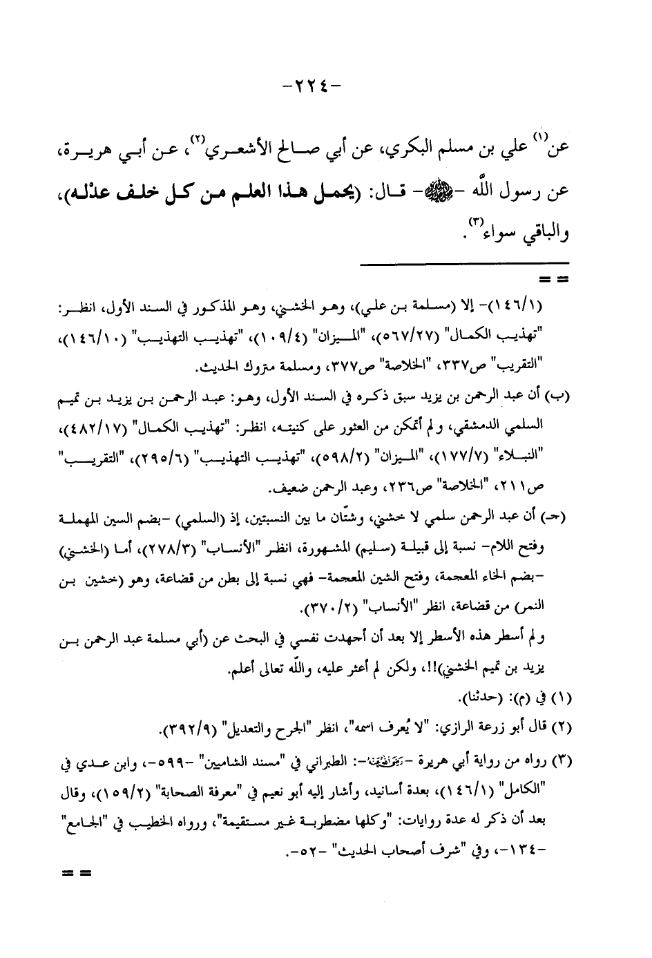 عَنْ عَلِيِّ بْنِ مُسْلِمٍ الْبَكْرِيُّ عَنْ أَبِي صَالِحٍ الْأَشْعَرِيُّ عَنْ أَبِي هُرَيْرَةَ عَنْ رَسُولِ اللَّهِ صَلَّى اللَّهُ عَلَيْهِ وَسَلَّمَ قَالَ (يَحْمِلُ هَذَا الْعِلْمَ مِنْ كُلِّ خَلَفٍ عَدْلُهُ) وَالْبَاقِي سَوَاءٌ