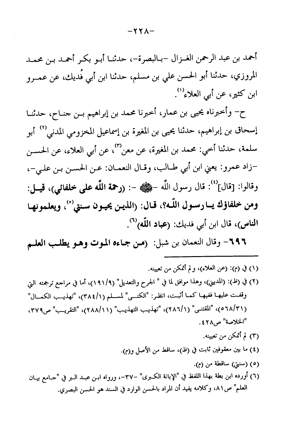 696 - وَقَالَ النُّعْمَانُ بْنُ شِبْلٍ (مَنْ جَاءَهُ الْمَوْتُ وَهُوَ يَطْلُبُ الْعِلْمَ لِيُحْيِي بِهِ الْإِسْلَامَ فَمَاتَ وَهُوَ عَلَى ذَلِكَ فَبَيْنَهُ وَبَيْنَ الْأَنْبِيَاءِ دَرَجَة وَاحِدَة) // لَيْسَ هَذَا من كَلَام النُّعْمَان بن شبْل كَمَا قد يظْهر لأوّل وهلة بل هُوَ حَدِيث رُوِيَ مَرْفُوعا //