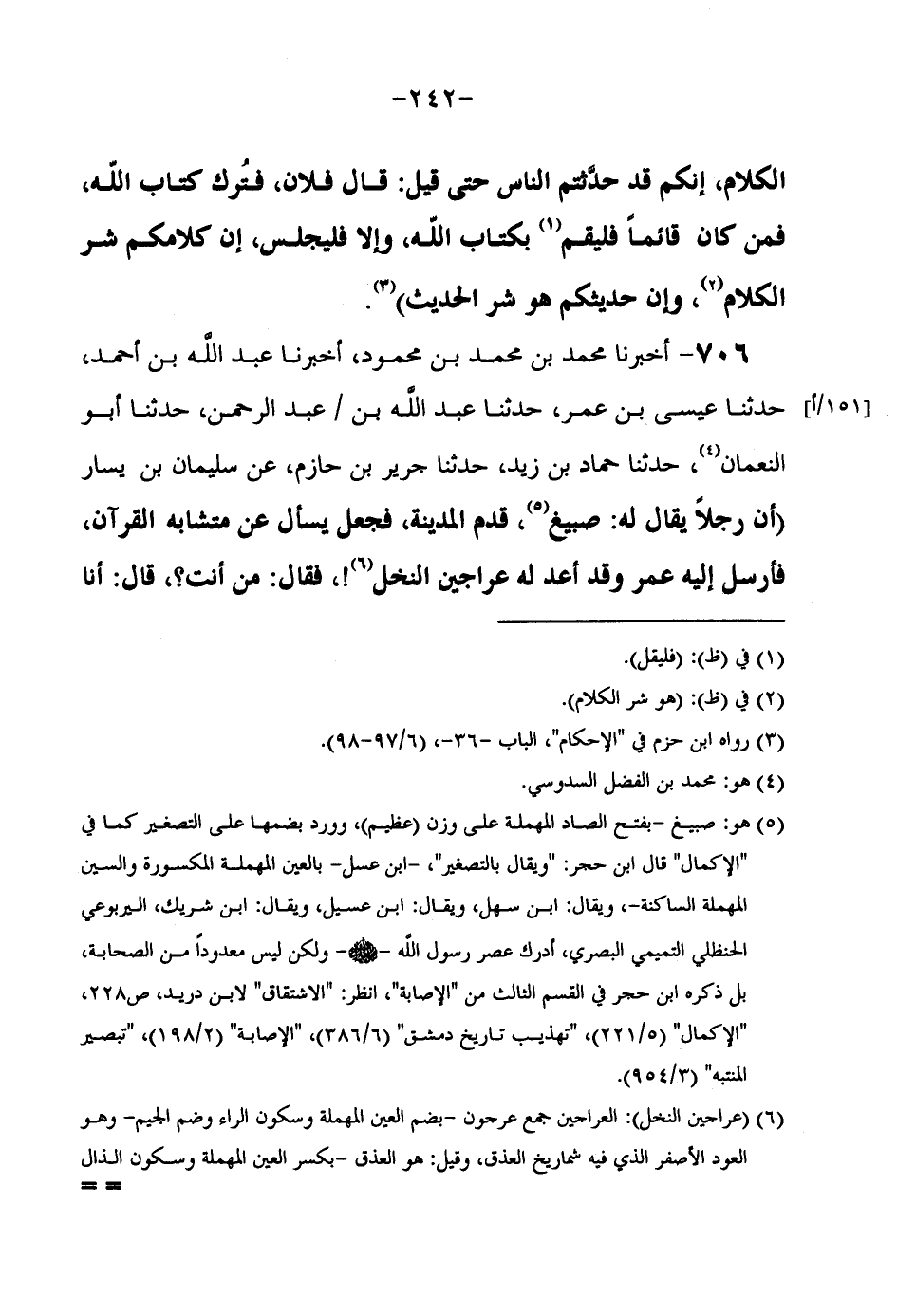 706 - أَخْبَرَنَا مُحَمَّدُ بْنُ مُحَمَّدِ بْنِ مَحْمُودٍ أَخْبَرَنَا عَبْدُ اللَّهِ بْنُ أَحْمَدَ حَدَّثَنَا عِيسَى بْنُ عُمَرَ حَدَّثَنَا عَبْدُ اللَّهِ بْنُ عَبْدِ الرَّحْمَنِ حَدَّثَنَا أَبُو النُّعْمَانِ حَدَّثَنَا حَمَّادُ بْنُ زَيْدٍ حَدَّثَنَا جَرِيرُ بْنُ حَازِمٍ عَنْ سُلَيْمَانَ بْنِ يَسَارٍ (أَنَّ رَجُلًا يُقَالُ لَهُ صُبَيْغٌ قَدِمَ الْمَدِينَةَ فَجَعَلَ يَسْأَلُ عَنْ مُتَشَابِهِ الْقُرْآنِ فَأَرْسَلَ إِلَيْهِ عُمَرُ وَقَدْ أَعَدَّ لَهُ عَرَاجِينَ النَّخْلِ فَقَالَ مَنْ أَنْتَ قَالَ أَنَا