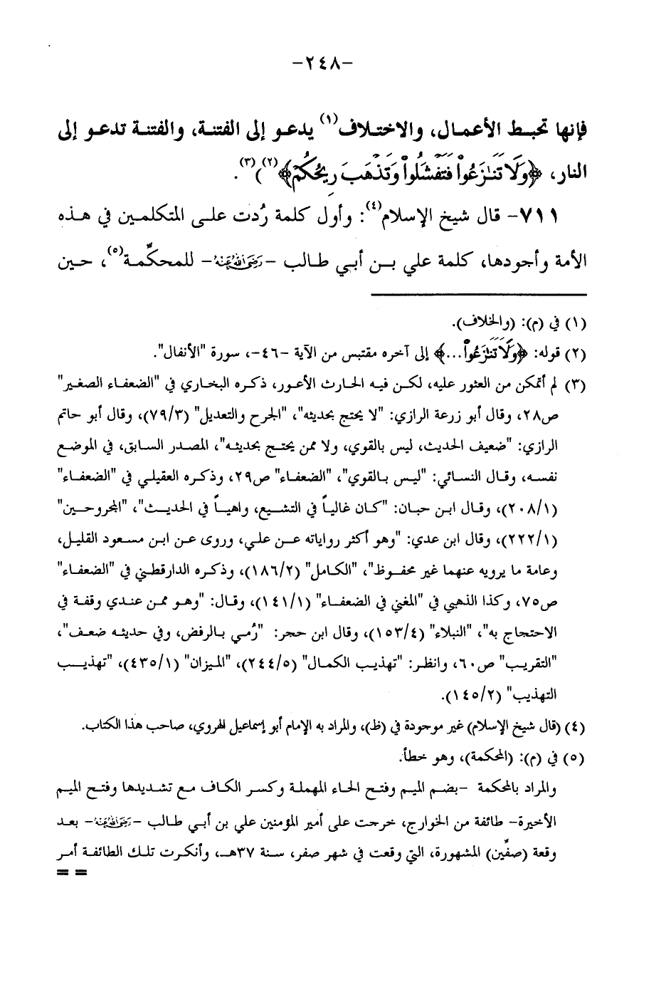 711 - قَالَ شَيْخُ الْإِسْلَامِ وَأَوَّلُ كَلِمَةٍ رُدَّتْ عَلَى الْمُتَكَلِّمِينَ فِي هذِهِ الْأُمَّةِ وَأَجْوَدِهَا كَلِمَةُ عَلِيِّ بْنِ أَبِي طَالِبٍ رَضِيَ اللَّهُ عَنْهُ لِلْمُحَكِّمَةِ حينَ