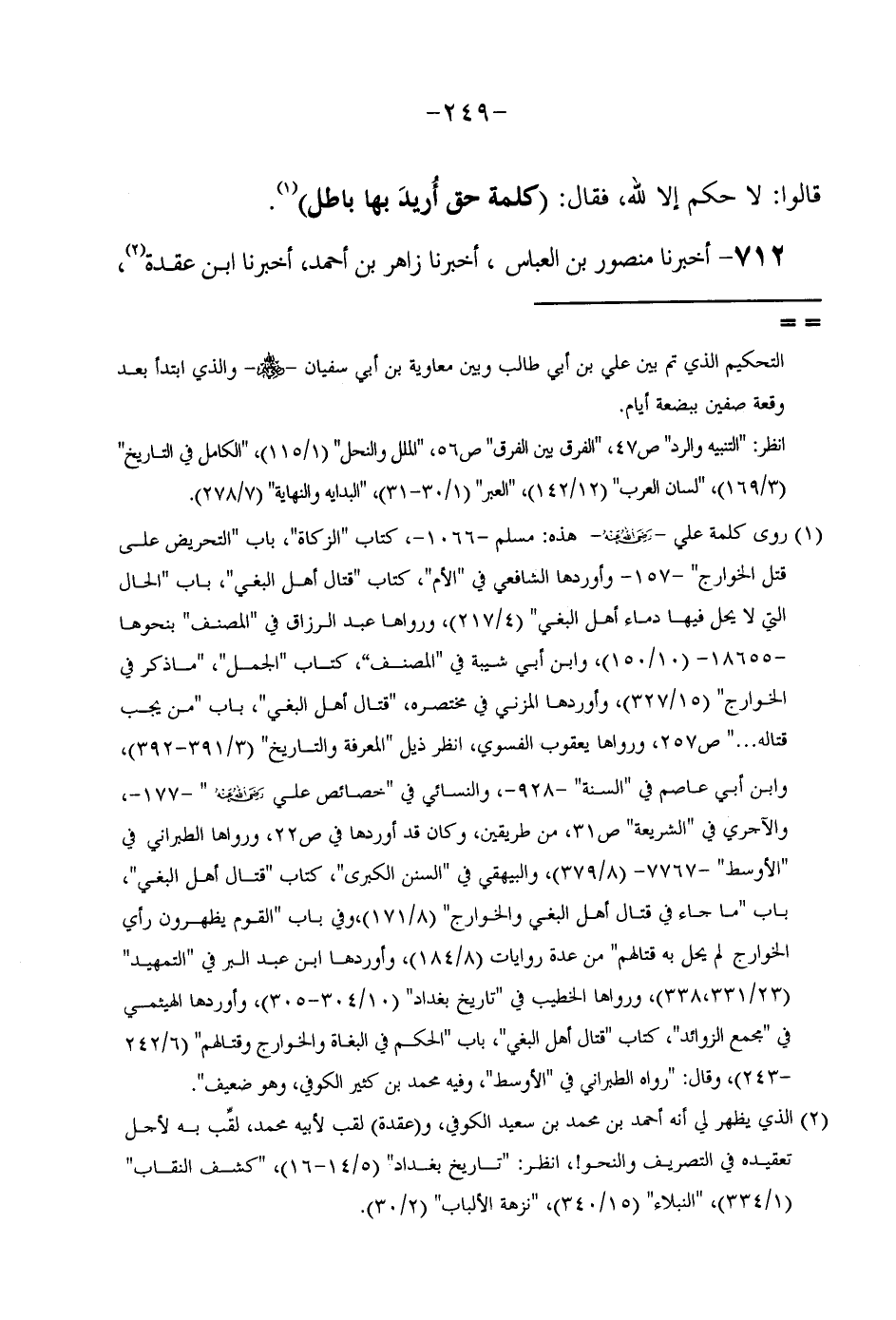 قَالُوا لَا حُكْمَ إِلَّا للَّهِ فَقَالَ (كَلِمَةُ حَقٍّ أُرِيدَ بِهَا بَاطِل) // روى كلمة عَليّ رَضِي الله عَنهُ هَذِه مُسلم كتاب الزَّكَاة بَاب التحريض //