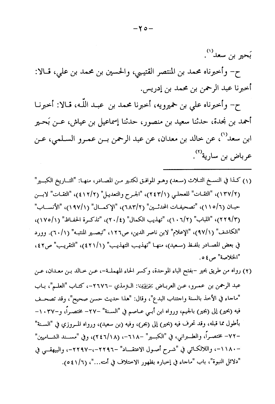 ح وَأَخْبَرَنَاهُ عَلِيُّ بْنُ خُمَيْرَوَيْهِ أَخْبَرَنَا مُحَمَّدُ بْنُ عَبْدِ اللَّهِ قالَا أَخْبَرَنَا أَحْمَدُ بْنُ نَجْدَةَ حَدَّثَنَا سَعِيدُ بْنُ مَنْصُورٍ حَدَّثَنَا إِسْمَاعِيلُ بْنُ عَيَّاشٍ عَن بحير ابْن سَعْدٍ عَنْ خَالِدِ بْنِ مَعْدَانَ عَنْ عَبْدِ الرَّحْمَنِ بْنِ عَمْرٍو السُّلَمِيُّ عَنْ عِرْبَاضِ بْنَ سَارِيَةَ حَدِيث حسن صَحِيح