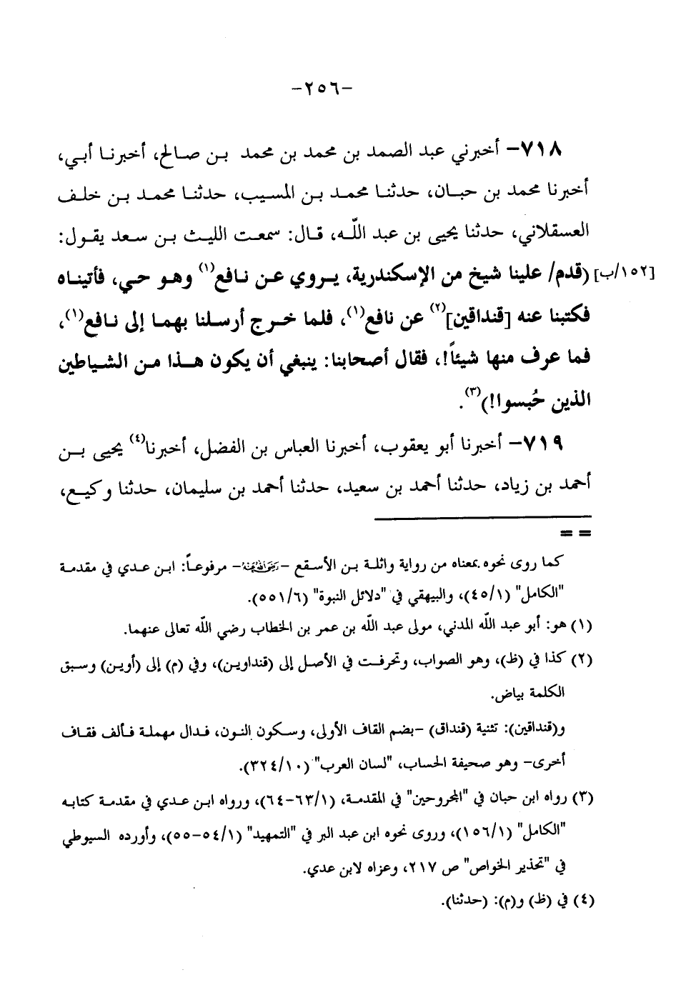 718 - أَخْبَرَنِي عَبْدُ الصَّمَدِ بْنُ مُحَمَّدِ بْنِ مُحَمَّدِ بْنِ صَالِحٍ أَخْبَرَنَا أَبِي أَخْبَرَنَا مُحَمَّدُ بْنُ حَبَّانَ حَدَّثَنَا مُحَمَّدُ بْنُ الْمُسَيَّبِ حَدَّثَنَا مُحَمَّدُ بْنُ خَلَفٍ الْعَسْقَلَانِيُّ حَدَّثَنَا يَحْيَى بْنُ عَبْدِ اللَّهِ قَالَ سَمِعْتُ اللَّيْثَ بْنَ سَعْدٍ يَقُولُ (قدم علينا شيخ من الْإسْكَنْدَريَّة يَرْوِي عَنْ نَافِعٍ وَهُوَ حَيٌّ فأتيناه فكتبنا عَنهُ قنداقين عَن نَافِع فَلَمَّا خَرَجَ أَرْسَلْنَا بِهِمَا إِلَى نَافِعٍ فَمَا عَرَفَ مِنْهَا شَيْئًا فَقَالَ أَصْحَابنَا يَنْبَغِي أَنْ يَكُونَ هَذَا مِنَ الشَّيَاطِينَ الَّذين حبسوا) // رَوَاهُ ابْن حبَان فِي الْمَجْرُوحين فِي الْمُقدمَة وَرَوَاهُ ابْن عدي فِي مُقَدّمَة كِتَابه //