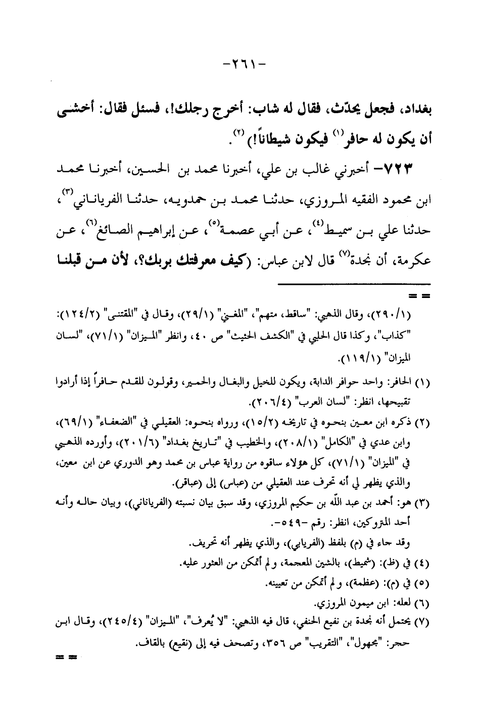 بَغْدَادَ فَجَعَلَ يُحَدِّثُ فَقَالَ لَهُ شَابٌّ أَخْرِجْ رِجْلَكَ فَسُئِلَ فَقَالَ أخْشَى أَن يكون حافر لَهُ فَيكون شَيْطَانا) // ذكره ابْن معِين بِنَحْوِهِ فِي تَارِيخه وَرَوَاهُ بِنَحْوِهِ الْعقيلِيّ فِي الضُّعَفَاء //