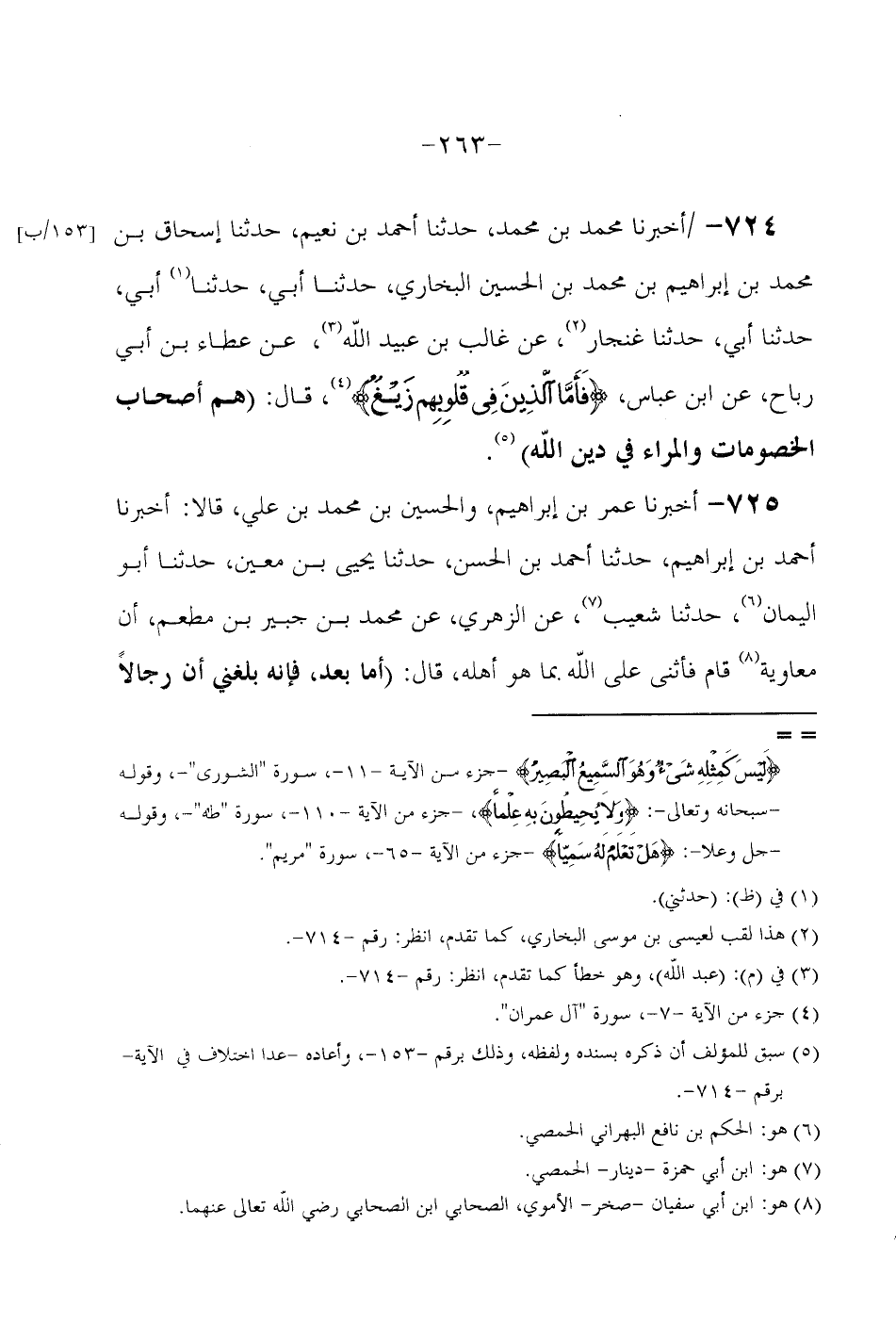 724 - أَخْبَرَنَا مُحَمَّدُ بْنُ مُحَمَّدٍ حَدَّثَنَا أَحْمَدُ بْنُ نُعَيْمٍ حَدَّثَنَا إِسْحَاقُ بْنُ مُحَمَّدِ بْنِ إِبْرَاهِيمَ بْنِ مُحَمَّدِ بْنِ الْحُسَيْنِ الْبُخَارِيُّ حَدَّثَنَا أَبِي حَدَّثَنَا أَبِي حَدَّثَنَا أَبِي حَدَّثَنَا غِنْجَارٌ عَنْ غَالِبِ بْنِ عُبَيْدِ اللَّهِ عَنْ عَطَاءِ بْنِ أَبِي رَبَّاحٍ عَنِ ابْنِ عَبَّاسٍ {فَأَمَّا الَّذِينَ فِي قُلُوبِهِمْ زَيْغٌ} قَالَ (هُمْ أَصْحَابُ الْخُصُومَاتِ وَالْمِرَاءِ فِي دين الله) // سبق للمؤلف أَن ذكره بِسَنَدِهِ وَلَفظه //