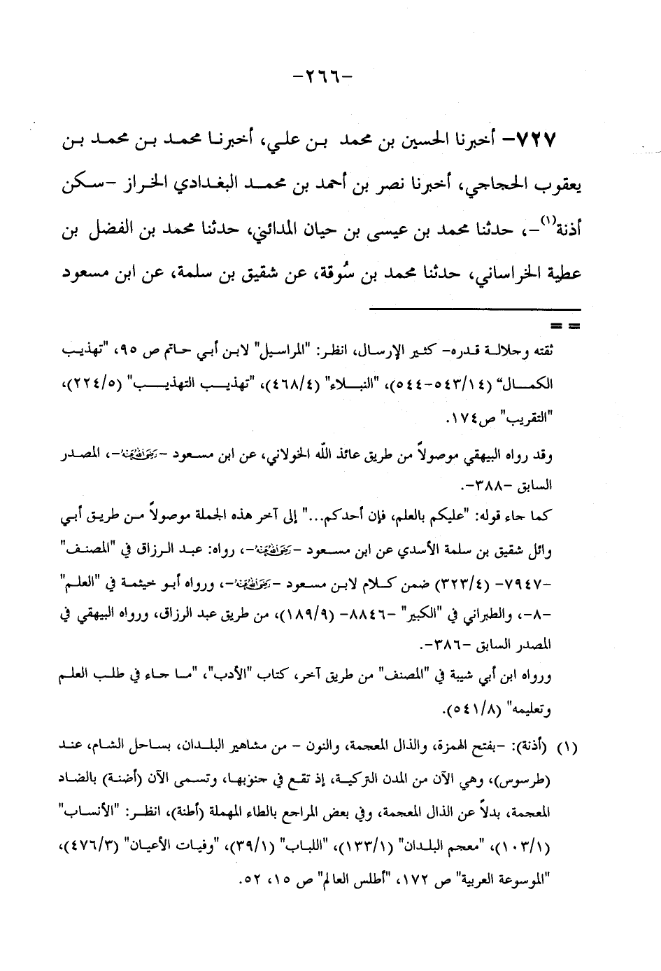 727 - أَخْبَرَنَا الْحُسَيْنُ بْنُ مُحَمَّدِ بْنِ عَلِيٍّ أَخْبَرَنَا مُحَمَّدُ بْنُ مُحَمَّدٍ بْنِ يَعْقُوبَ الْحَجَّاجِيُّ أَخْبَرَنَا نَصْرُ بْنُ أَحْمَدَ بْنِ مُحَمَّدٍ الْبَغْدَادِيُّ الْخَرَّازُ سَكَنَ أَذَنَةَ حَدَّثَنَا مُحَمَّدُ بْنُ عِيسَى بْنِ حَيَّانَ الْمَدَائِنِيُّ حَدَّثَنَا مُحَمَّدُ بْنُ الْفَضْلِ بْنِ عَطِيَّةَ الْخُرَاسَانِيُّ حَدَّثَنَا مُحَمَّدُ بْنُ سُوقَةَ عَنْ شَقِيقِ بْنِ سَلَمَةَ عَنِ ابْنِ مَسْعُودِ