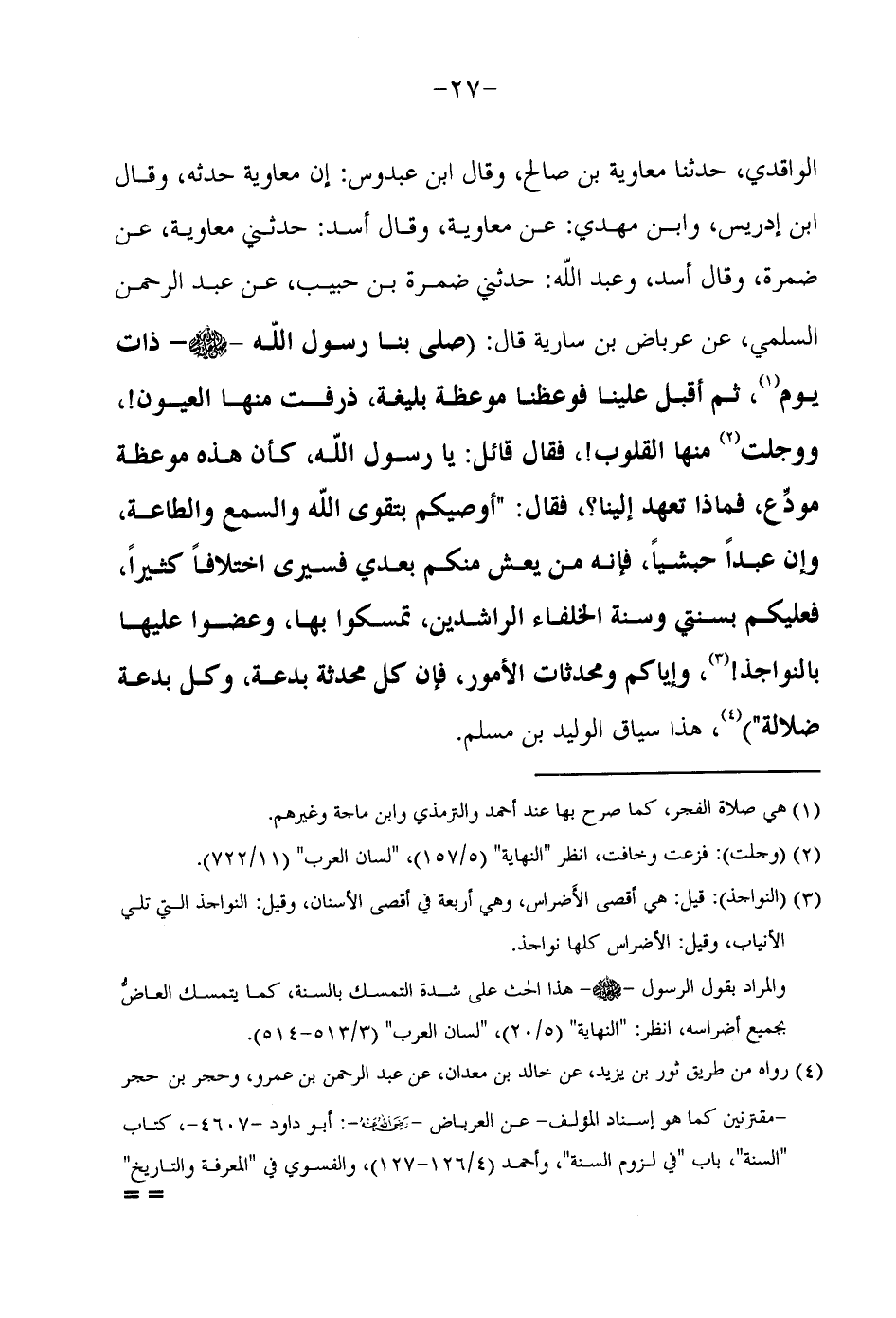 الْوَاقِدِيُّ حَدَّثَنَا مُعَاوِيَةُ بْنُ صَالِحِ وَقَالَ ابْنُ عَبْدُوسٍ إِنَّ مُعَاوِيَةَ حَدَّثَهُ وَقَالَ ابْنُ إِدْرِيسَ وَابْنُ مَهْدِيٍّ عَنْ مُعَاوِيَةَ وَقَالَ أَسَدٌ حَدَّثَنِي مُعَاوِيَةُ عَنْ ضَمْرَةَ وَقَالَ أَسَدٌ وَعَبْدُ اللَّهِ حَدَّثَنِي ضَمْرَةُ بْنُ حَبِيبٍ عَنْ عَبْدِ الرَّحْمَنِ السُّلَمِيُّ عَنْ عِرْبَاضِ بْنَ سَارِيَةَ قَالَ (صَلَّى بِنَا رَسُولُ اللَّهِ صَلَّى اللَّهُ عَلَيْهِ وَسَلَّمَ ذَاتَ يَوْمٍ ثُمَّ أَقْبَلَ عَلَيْنَا فَوَعَظَنَا مَوْعِظَةً بَلِيغَةً ذَرَفَتْ مِنْهَا الْعُيُونُ وَوَجِلَتْ مِنْهَا الْقُلُوبُ فَقَالَ قَائِلٌ يَا رَسُولَ اللَّهِ كَأَنَّ هَذِهِ مَوْعِظَةَ مُوَدِّعٌ فَمَاذَا تَعْهِدُ إِلَيْنَا فَقَالَ أُوصِيكُمْ بِتَقْوَى اللَّهِ وَالسَّمْعِ وَالطَّاعَةِ وَإِنْ عَبْدًا حَبَشِيًّا فَإِنَّهُ مَنْ يَعِشْ مِنْكُمْ بَعْدِي فَسَيَرَى اخْتِلَافًا كَثِيرًا فَعَلَيْكُمْ بِسُنَّتِي وَسُنَّةِ الْخُلَفَاءِ الرَّاشِدِينَ تَمَسَّكُوا بِهَا وَعُضُّوا عَلَيْهَا بِالنَّوَاجِذِ وَإِيَّاكُمْ وَمُحْدَثَاتِ الْأُمُورِ فَإِنَّ كُلَّ مُحْدَثَةٍ بِدْعَةٍ وَكُلَّ بِدعَة ضَلَالَة) رَوَاهُ من طَرِيق ثَوْرِ بْنِ يَزِيدَ عَنْ خَالِدِ بْنِ مَعْدَانَ عَنْ عَبْدِ الرَّحْمَنِ بْنِ عَمْرٍو وَحُجْرِ بْنِ حُجْرٍ هَذَا سِيَاقُ الْوَلِيدِ بْنِ مُسْلِمٍ