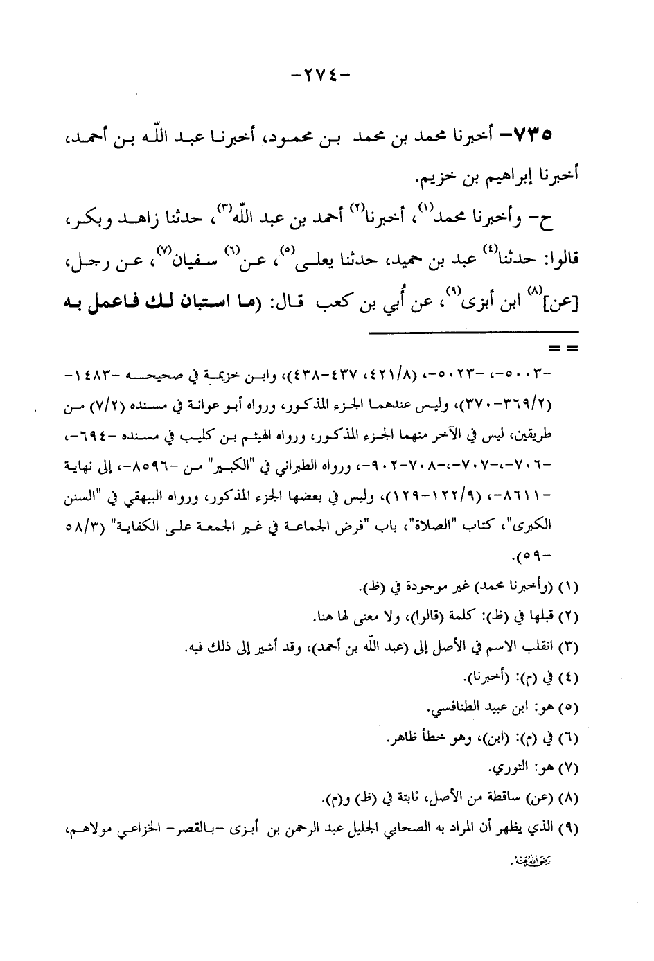 ح وَأَخْبَرَنَا مُحَمَّدٌ أَخْبَرَنَا أَحْمَدُ بْنُ عَبْدِ اللَّهِ حَدَّثَنَا زَاهِدٌ وَبَكْرٌ قَالُوا حَدَّثَنَا عَبْدُ بْنُ حُمَيْدٍ حَدَّثَنَا يَعْلَى عَنْ سُفْيَانَ عَنْ رَجُلٍ عَنِ ابْنِ أَبْزَى عَنْ أُبَيِّ بْنِ كَعْبٍ قَالَ (مَا اسْتَبَانَ لَكَ فَاعْمَلْ بِهِ