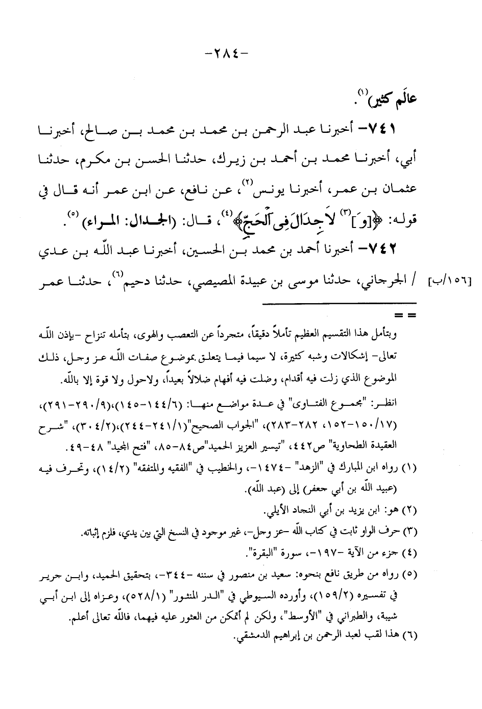741 - أَخْبَرَنَا عَبْدُ الرَّحْمَنِ بْنُ مُحَمَّدِ بْنِ مُحَمَّدِ بْنِ صَالِحٍ أَخْبَرَنَا أَبِي أَخْبَرَنَا مُحَمَّدُ بْنُ أَحْمَدَ بن زريك حَدَّثَنَا الْحَسَنُ بْنُ مُكْرِمٍ حدَّثَنَا عُثْمَانُ بْنُ عُمَرَ أَخْبَرَنَا يُونُسُ عَنْ نَافِعٍ عَنِ ابْنِ عُمَرَ أَنَّهُ قَالَ فِي قَوْلِهِ {وَلا جِدَال فِي الْحَج} قَالَ (الْجِدَال المراء) // رَوَاهُ من طَرِيق نَافِع بِنَحْوِهِ سعيد بن مَنْصُور فِي سنَنه بتحقيق الحميد وَابْن جرير //