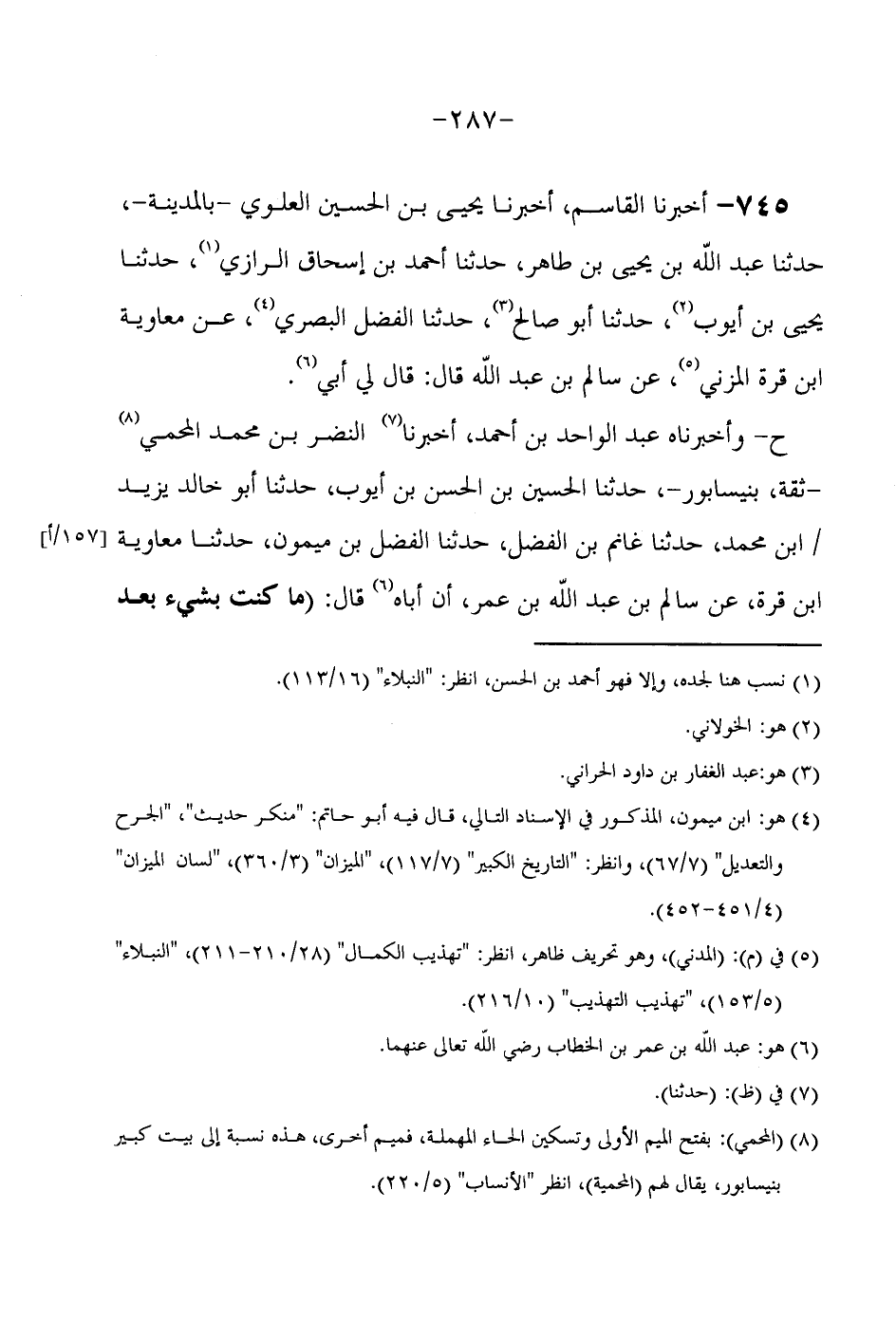 ح وَأَخْبَرَنَاهُ عَبْدُ الْوَاحِدِ بْنُ أَحْمَدَ أَخْبَرَنَا النَّضْرُ بْنُ مُحَمَّدٍ الْمَحْمِيُّ ثِقَةٌ بِنَيْسَابُورَ حَدَّثَنَا الْحُسَيْنُ بْنُ الْحَسَنِ بْنِ أَيُّوبَ حَدثنَا أَبُو خَالِد يزِيد ابْن مُحَمَّدٍ حَدَّثَنَا غَانِمُ بْنُ الْفَضْلِ حَدَّثَنَا الْفَضْلُ بْنُ مَيْمُونَ حَدَّثَنَا مُعَاوِيَة ابْن قُرَّةَ عَنْ سَالِمِ بْنِ عَبْدِ اللَّهِ بْنِ عُمَرَ أَنَّ أَبَاهُ قَالَ (مَا كُنْتُ بِشَيْءٍ بَعْدَ