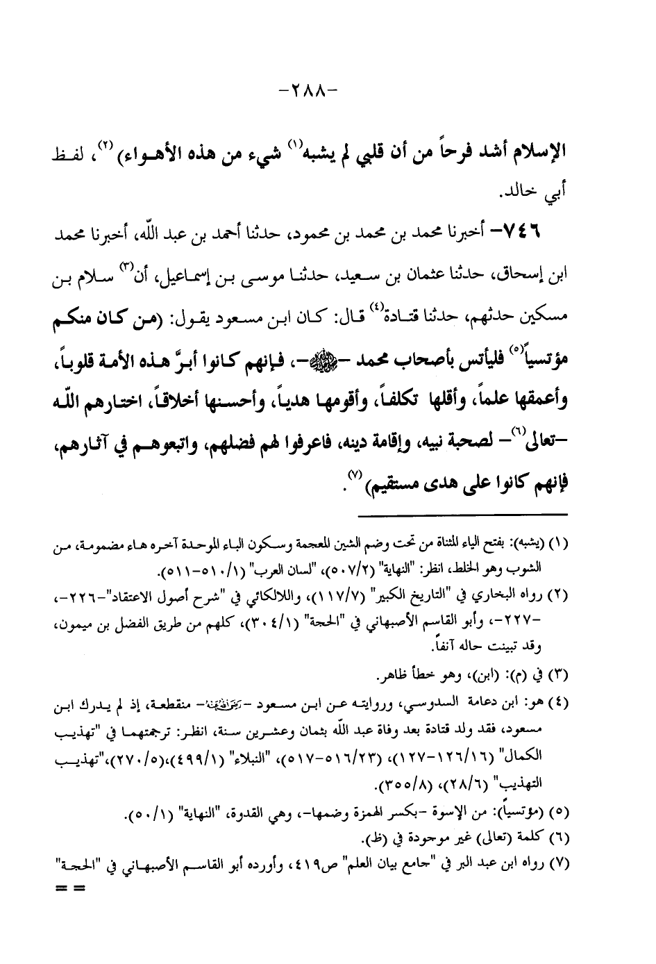 746 - أَخْبَرَنَا مُحَمَّدُ بْنُ مُحَمَّدِ بْنِ مَحْمُودٍ حَدَّثَنَا أَحْمَدُ بْنُ عَبْدِ اللَّهِ أَخْبَرَنَا مُحَمَّد ابْن إِسْحَاقَ حَدَّثَنَا عُثْمَانُ بْنُ سَعِيدٍ حَدَّثَنَا مُوسَى بْنُ إِسْمَاعِيلَ أَنَّ سَلَامَ بْنَ مِسْكِينٍ حَدَّثَهُمْ حَدَّثَنَا قَتَادَةُ قَالَ كَانَ ابْنُ مَسْعُودٍ يَقُولُ (مَنْ كَانَ مِنْكُمْ مُؤْتَسِيًا فَلْيَأْتَسِ بِأَصْحَابِ مُحَمَّدٍ صَلَّى اللَّهُ عَلَيْهِ وَسَلَّمَ فَإِنَّهُمْ كَانُوا أَبَرَّ هَذِهِ الْأُمَّةِ قُلُوبًا وَأَعْمَقَهَا عَلْمًا وَأَقَلَّهَا تَكَلُّفًا وَأَقْوَمَهَا هَدْيًا وَأَحْسَنَهَا أَخْلَاقًا اخْتَارَهُمُ اللَّهُ تَعَالَى لِصُحْبَةِ نَبِيِّهِ وَإِقَامَةِ دِينِهِ فَاعْرِفُوا لَهُمْ فَضْلَهُمْ وَاتَّبِعُوهُمْ فِي آثَارِهِمْ فَإِنَّهُمْ كَانُوا على هدى مُسْتَقِيم) // رَوَاهُ ابْن عبد الْبر فِي جَامع بَيَان الْعلم وَأوردهُ أَبُو الْقَاسِم الْأَصْبَهَانِيّ فِي الْحجَّة //