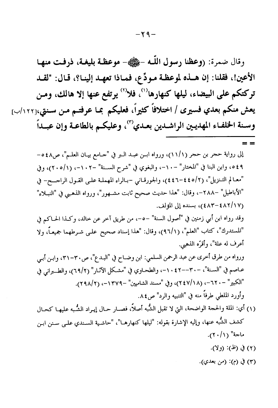 وَقَالَ ضَمْرَةُ (وَعَظَنَا رَسُولُ اللَّهِ صَلَّى اللَّهُ عَلَيْهِ وَسَلَّمَ مَوْعِظَةً بَلِيغَةً ذَرَفَتْ مِنْهَا الْأَعْيُنُ فَقُلْنَا إِنَّ هَذِهِ لَمَوْعِظَةِ مُوَدِّعٍ فَمَاذَا تَعْهَدُ إِلَيْنَا قَالَ لَقَدْ تَرَكْتُكُمْ عَلَى الْبَيْضَاءِ لَيْلُهَا كَنَهَارِهَا فَلَا يَرْتَفِعُ عَنْهَا إِلَّا هَالِكٌ وَمَنْ يَعِشْ مِنْكُمْ بَعْدِي فَسَيَرَى اخْتِلَافًا كَثِيرًا فَعَلَيْكُمْ بِمَا عَرَفْتُمْ مِنْ سُنَّتِي وَسُنَّةِ الْخُلَفَاءِ الْمُهْدِيِّينَ الرَّاشِدِينَ بَعْدِي وَعَلَيْكُمْ بِالطَّاعَةِ وَإِنْ عَبْدًا