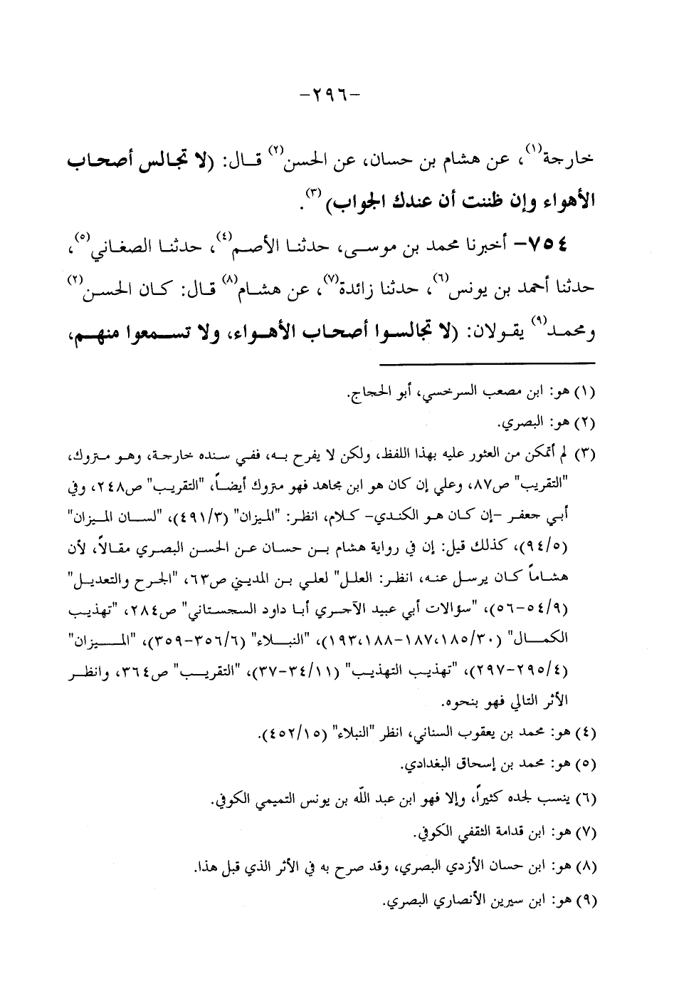 754 - أَخْبَرَنَا مُحَمَّدُ بْنُ مُوسَى حَدَّثَنَا الْأَصَمُّ حَدَّثَنَا الصَّغَانِيُّ حَدَّثَنَا أَحْمَدُ بْنُ يُونُسَ حَدَّثَنَا زَائِدَةُ عَنْ هِشَامٍ قَالَ كَانَ الْحَسَنُ وَمُحَمَّدُ يَقُولَانِ (لَا تُجَالِسُوا أَصْحَابَ الْأَهْوَاءِ وَلَا تَسْمَعُوا مِنْهُمْ
