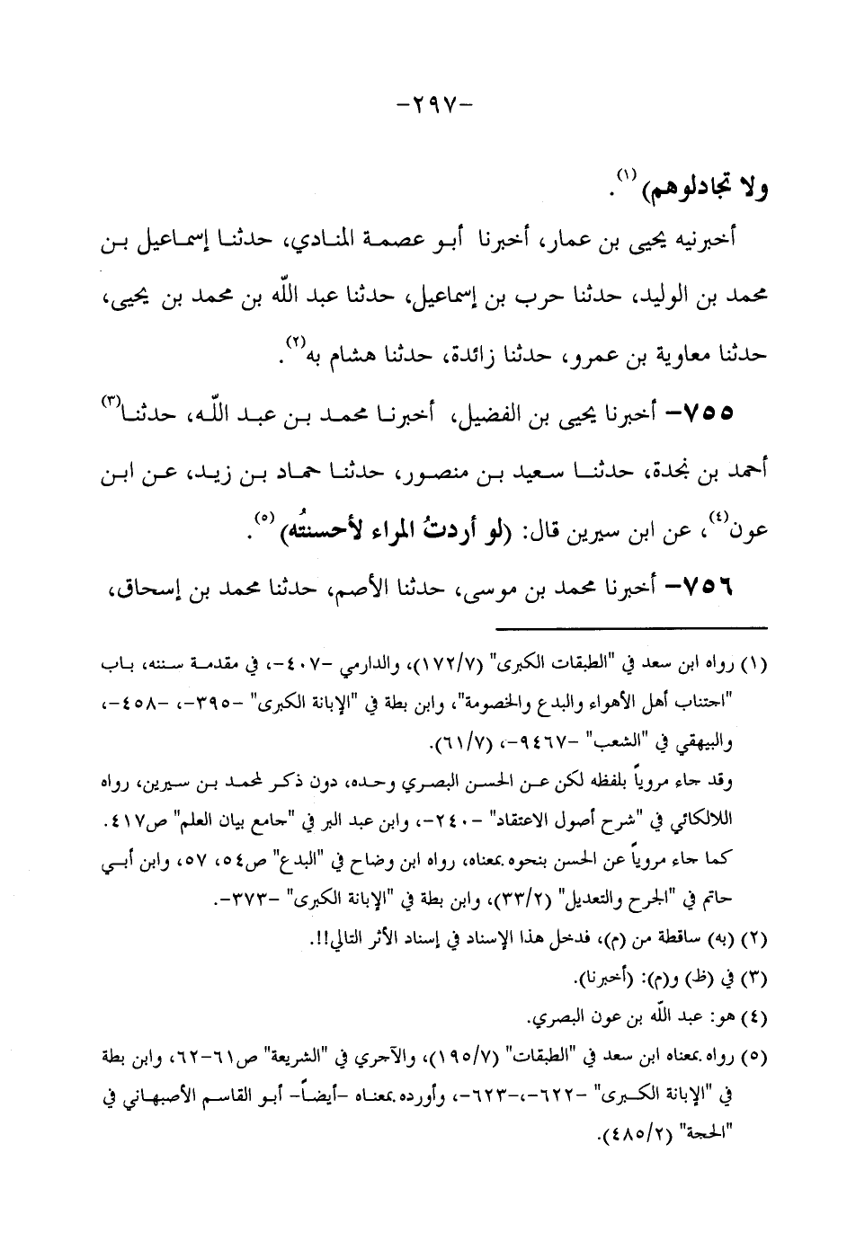755 - أَخْبَرَنَا يَحْيَى بْنُ الْفُضَيْلِ أَخْبَرَنَا مُحَمَّدُ بْنُ عَبْدِ اللَّهِ حَدَّثَنَا أَحْمَدُ بْنُ نَجْدَةَ حَدَّثَنَا سَعِيدُ بْنُ مَنْصُورٍ حَدَّثَنَا حَمَّادُ بْنُ زَيْدٍ عَنِ ابْنِ عَوْنٍ عَنِ ابْنِ سِيرِينَ قَالَ (لَوْ أَرَدْتُ الْمِرَاءَ لأحسنته) // رَوَاهُ بِمَعْنَاهُ ابْن سعد فِي الطَّبَقَات والآجري فِي الشَّرِيعَة وَابْن بطة //