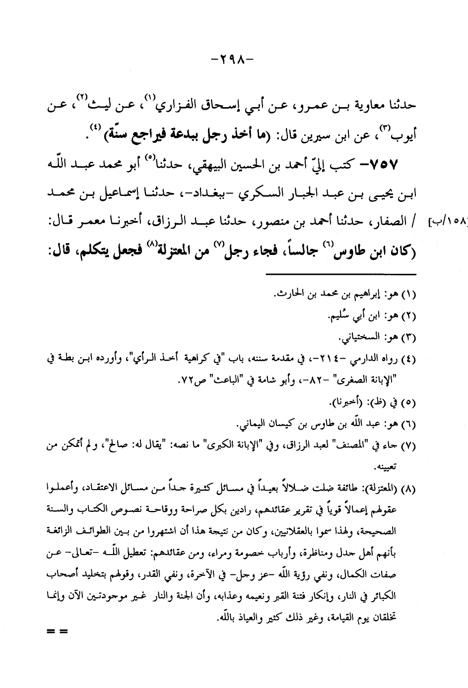 757 - كَتَبَ إِلَيَّ أَحْمَدُ بْنُ الْحُسَيْنِ الْبَيْهَقِيُّ حَدَّثَنَا أَبُو مُحَمَّدٍ عَبْدُ الله ابْن يَحْيَى بْنِ عَبْدِ الْجَبَّارِ السُّكَّرِيُّ بِبَغْدَادَ حَدَّثَنَا إِسْمَاعِيلُ بْنُ مُحَمَّدٍ الصَّفَّارُ حَدَّثَنَا أَحْمَدُ بْنُ مَنْصُورٍ حَدَّثَنَا عَبْدُ الرَّزَّاقِ أَخْبَرَنَا مَعْمَرٌ قَالَ (كَانَ ابْنُ طَاوُسٍ جَالِسًا فَجَاءَ رَجُلٌ مِنَ الْمُعْتَزِلَةِ فَجَعَلَ يَتَكَلَّمُ قَالَ