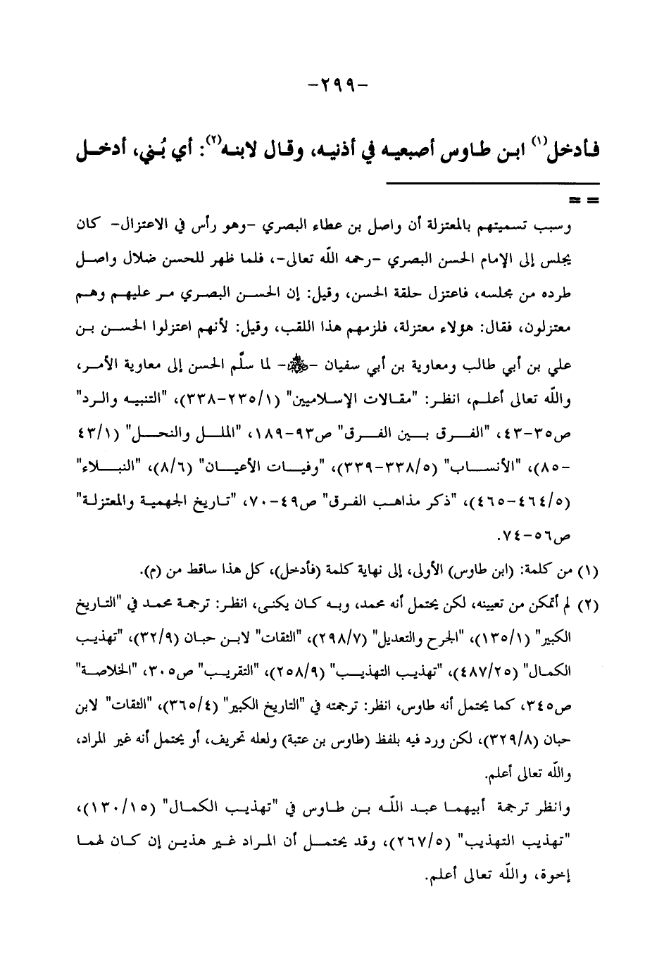 فَأَدْخَلَ ابْنُ طَاوُسٍ أَصْبُعَيْهِ فِي أُذُنَيْهِ وَقَالَ لِابْنِهِ أَيْ بُنَيَّ أَدْخِلْ