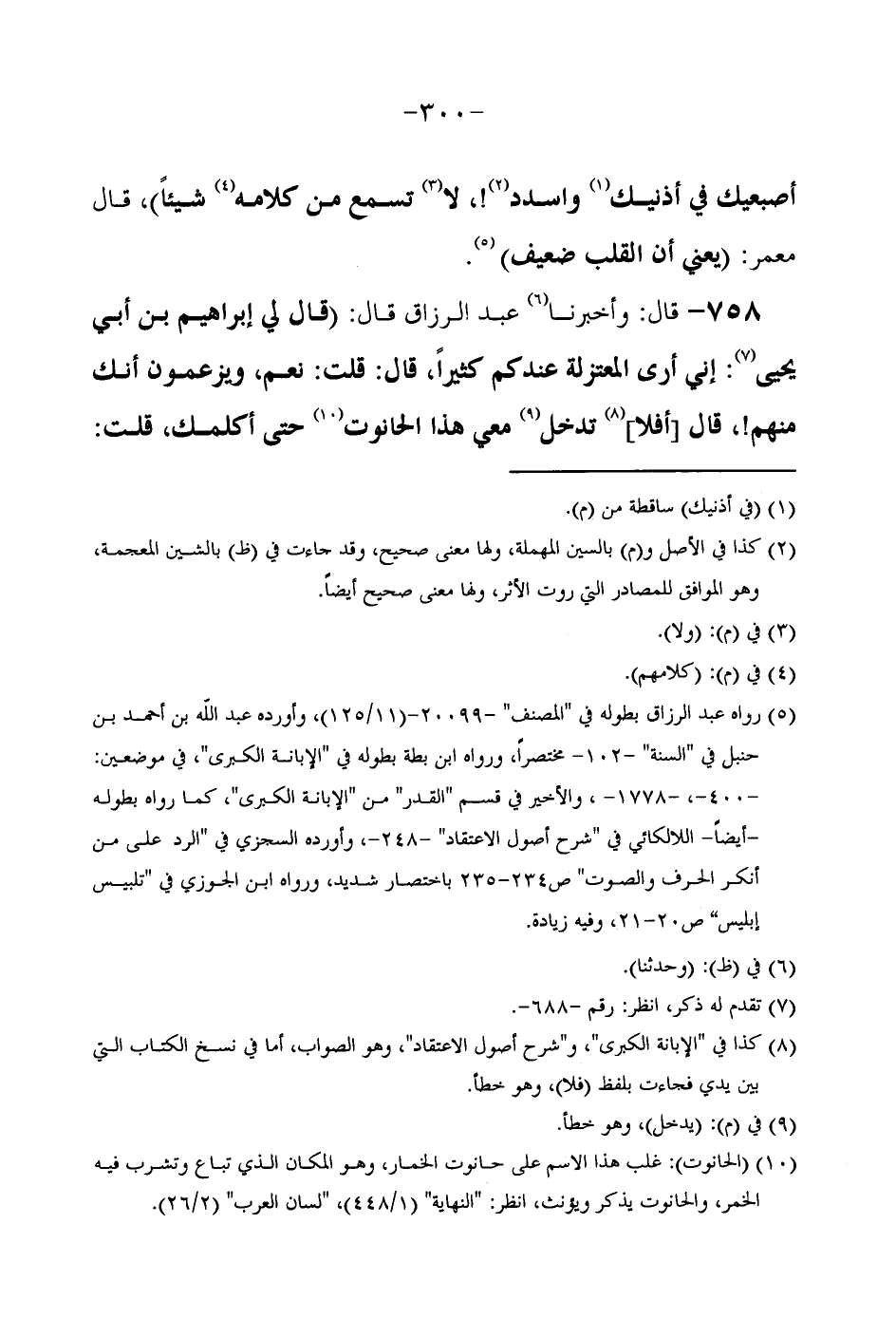 أَصْبُعَيْكَ فِي أُذُنَيْكَ وَاسْدُدْ لَا تَسْمَعْ مِنْ كَلَامِهِ شَيْئًا) قَالَ مَعْمَرٌ (يَعْنِي أَنَّ الْقَلْبَ ضَعِيفٌ) // رَوَاهُ عبد الرَّزَّاق بِطُولِهِ فِي المُصَنّف وَأوردهُ عَبْدُ اللَّهِ بْنُ أَحْمَدَ بْنِ //