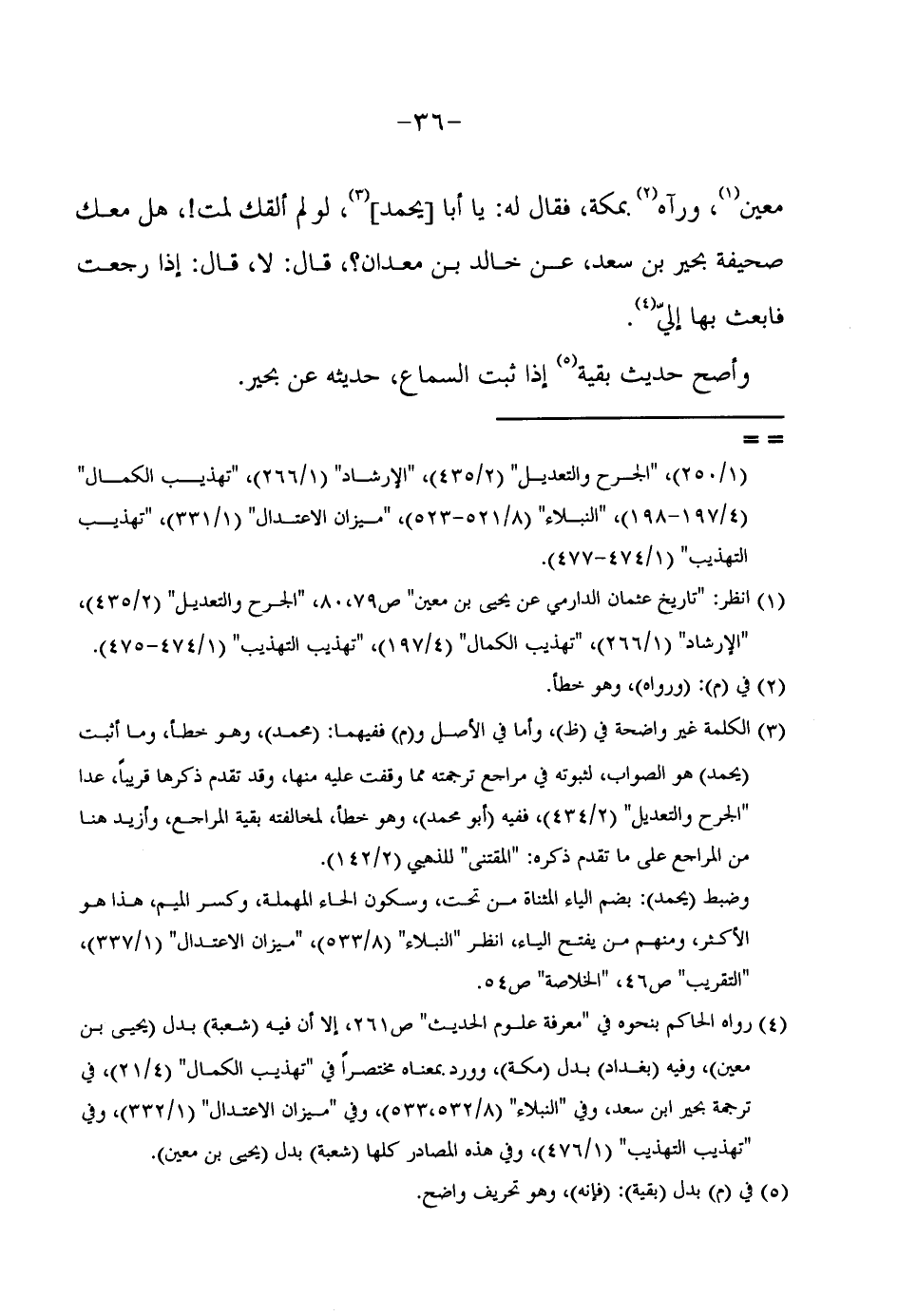 مَعِينٍ وَرَآهُ بِمَكَّةَ فَقَالَ لَهُ يَا أَبَا يُحْمَدَ لَوْ لَمْ أَلْقَكَ لَمِتُّ هَلْ مَعَكَ صَحِيفَةُ بَحِيرِ بْنِ سَعْدٍ عَنْ خَالِدِ بْنِ مَعْدَانَ قَالَ لَا قَالَ إِذَا رَجَعْتَ فَابْعَثْ بِهَا إِلَيَّ
