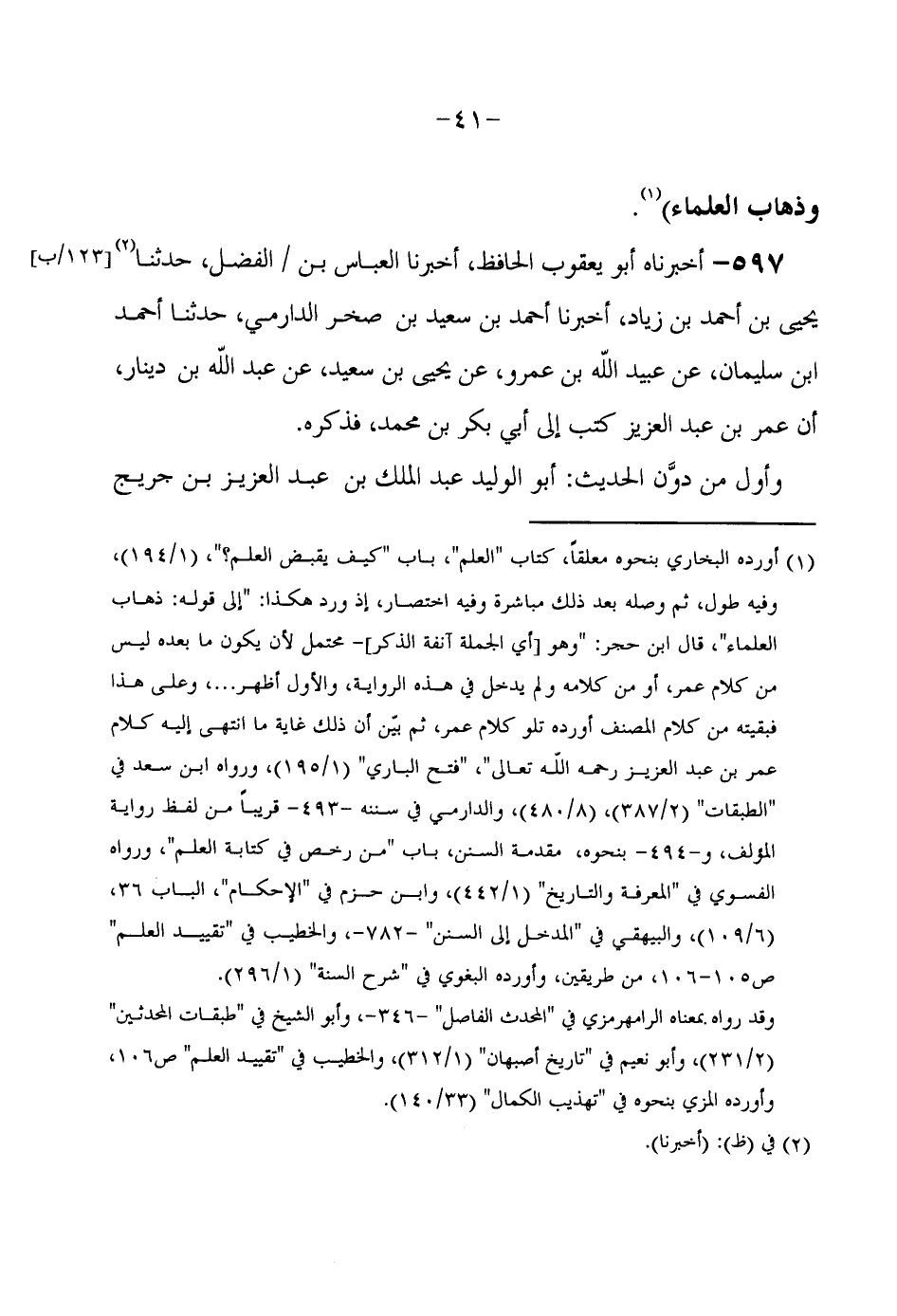 597 - أَخْبَرَنَاهُ أَبُو يَعْقُوبَ الْحَافِظُ أَخْبَرَنَا الْعَبَّاسُ بْنُ الْفَضْلِ حَدَّثَنَا يَحْيَي بْنُ أَحْمَدَ بْنِ زِيَادٍ أَخْبَرَنَا أَحْمَدُ بْنُ سَعِيدِ بْنِ صَخْرٍ الدَّارمِيّ حَدثنَا أَحْمد ابْن سُلَيْمَانَ عَنْ عُبَيْدِ اللَّهِ بْنِ عَمْرٍو عَنْ يَحْيَى بْنِ سَعِيدٍ عَنْ عَبْدِ اللهِ بْنِ دِينَارٍ أَنَّ عُمَرَ بْنَ عَبْدِ الْعَزِيزِ كَتَبَ إِلَى أَبِي بَكْرِ بْنِ مُحَمَّدٍ فَذَكَرَهُ