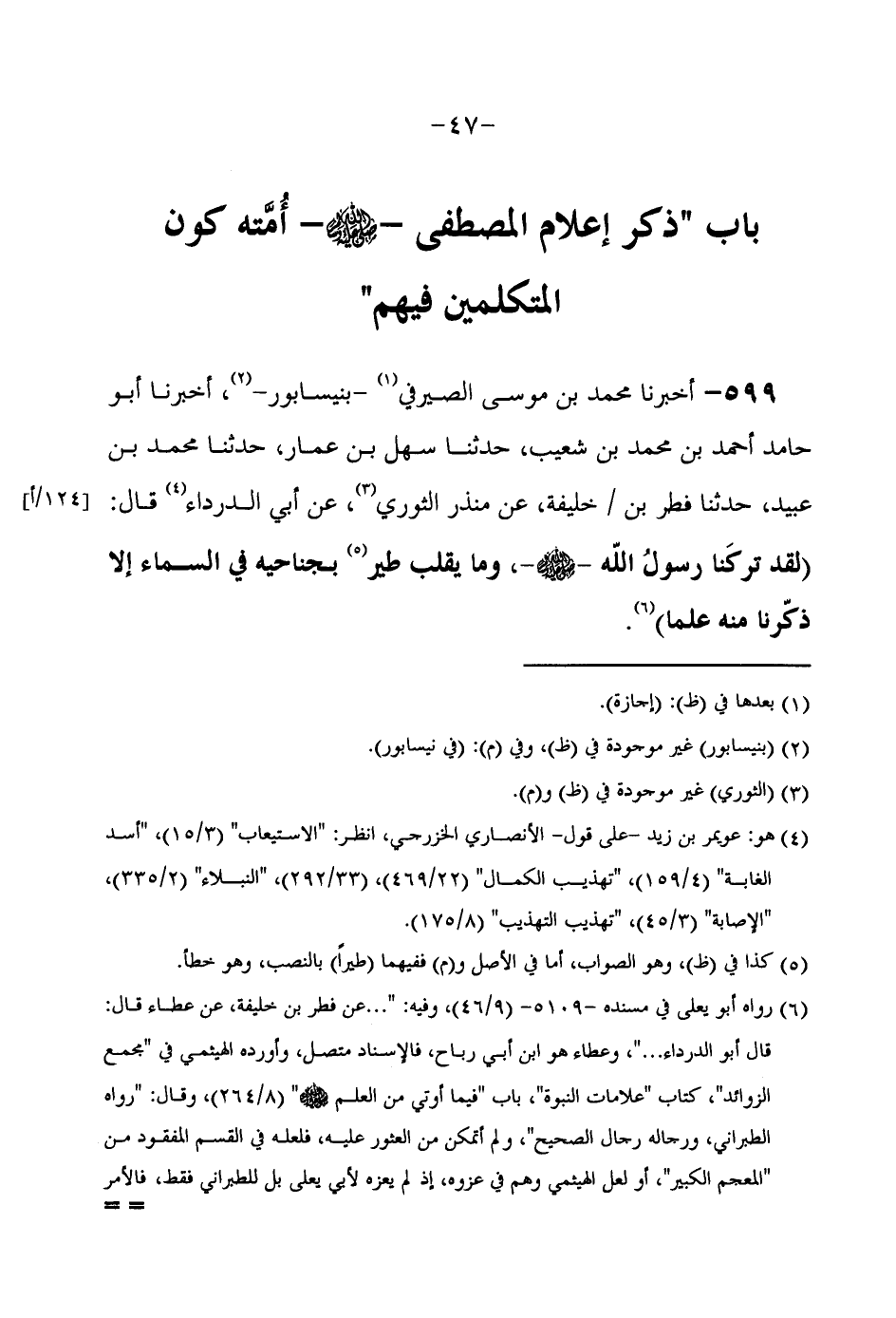 599 - أَخْبَرَنَا مُحَمَّدُ بْنُ مُوسَى الصَّيْرَفِيُّ بِنَيْسَابُورَ أَخْبَرَنَا أَبُو حَامِدٍ أَحْمَدُ بْنُ مُحَمَّدِ بْنِ شُعَيْبٍ حَدَّثَنَا سَهْلُ بْنُ عَمَّارٍ حَدَّثَنَا مُحَمَّدُ بْنُ عُبَيْدٍ حَدَّثَنَا فِطْرُ بْنُ خَلِيفَةَ عَنْ مُنْذِرٍ الثَّوْرِيِّ عَنْ أَبِي الدَّرْدَاءِ قَالَ (لَقَدْ تَرَكَنَا رَسُولُ اللَّهِ صَلَّى اللَّهُ عَلَيْهِ وَسَلَّمَ وَمَا يُقَلِّبُ طَيْرٌ بِجَنَاحَيْهِ فِي السَّمَاءِ إِلَّا ذكرنَا مِنْهُ علما رَوَاهُ أَبُو يعلى فِي مُسْنده وَفِيه عَن فطر بن خَليفَة عَن عَطاء قَالَ