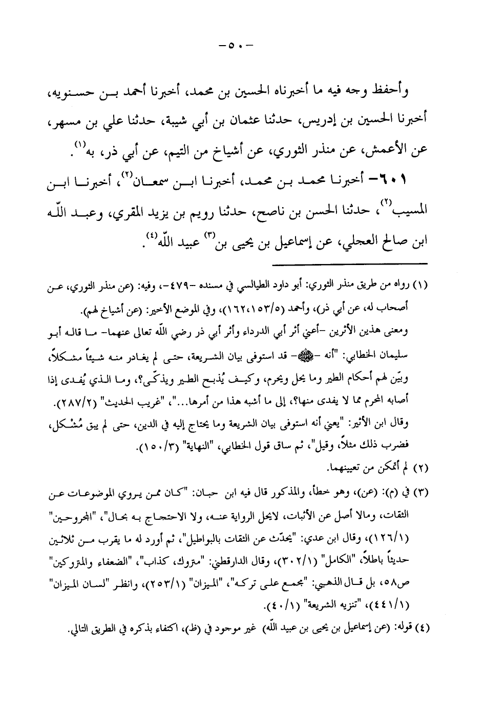 وَأَحْفَظُ وَجْهٍ فِيهِ مَا أَخْبَرَنَاهُ الْحُسَيْنُ بْنُ مُحَمَّدٍ أَخْبَرَنَا أَحْمَدُ بْنُ حَسْنَوَيْهِ أَخْبَرَنَا الْحُسَيْنُ بْنُ إِدْرِيسَ حَدَّثَنَا عُثْمَانُ بْنُ أَبِي شَيْبَةَ حَدَّثَنَا عَلِيُّ بْنُ مُسْهَرٍ عَنِ الْأَعْمَشِ عَنْ مُنْذِرٍ الثَّوْرِيِّ عَنْ أَشْيَاخٍ مِنَ التَّيْمِ عَنْ أَبِي ذَرٍّ بِهِ