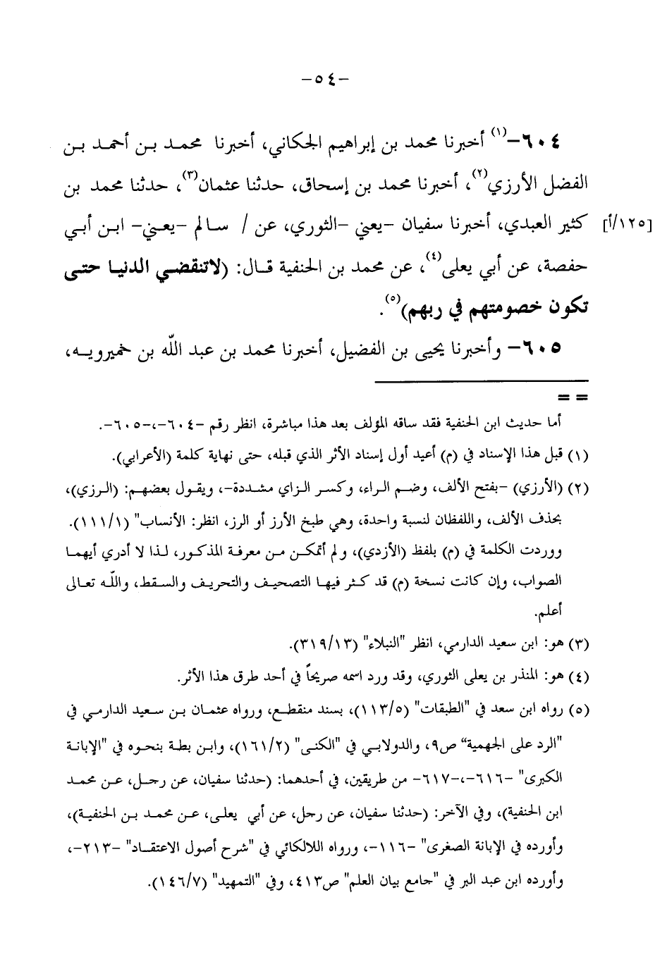 604 - أَخْبَرَنَا مُحَمَّدُ بْنُ إِبْرَاهِيمَ الْجَكَانِيُّ أَخْبَرَنَا مُحَمَّدُ بْنُ أَحْمَدَ بْنِ الْفَضْلِ الْأُرْزِيُّ أَخْبَرَنَا مُحَمَّدُ بْنُ إِسْحَاقَ حَدَّثَنَا عُثْمَانُ حَدَّثَنَا مُحَمَّدُ بْنُ كَثِيرٍ الْعَبْدِيُّ أَخْبَرَنَا سُفْيَانُ يَعْنِي الثَّوْرِيَّ عَنْ سَالِمٍ يَعْنِي ابْنَ أَبِي حَفْصَةَ عَنْ أَبِي يَعْلَى عَنْ مُحَمَّدِ بْنِ الْحَنَفِيَّةِ قَالَ (لَا تَنْقَضِي الدُّنْيَا حَتَّى تكون خصومتهم فِي رَبهم) رَوَاهُ ابْن سعد فِي الطَّبَقَات بِسَنَد مُنْقَطع وَرَوَاهُ عُثْمَان بن سعيد الدَّارمِيّ
