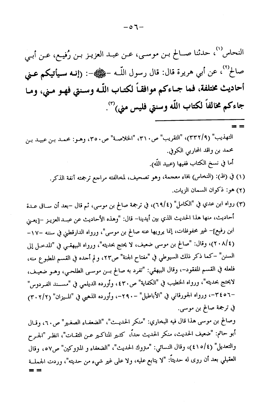 النَّحَّاسُ حَدَّثَنَا صَالِحُ بْنُ مُوسَى عَنْ عَبْدِ الْعَزِيزِ بْنِ رَفِيعٍ عَنْ أَبِي صَالِحٍ عَنْ أَبِي هُرَيْرَةَ قَالَ قَالَ رَسُولُ اللَّهِ صَلَّى اللَّهُ عَلَيْهِ وَسَلَّمَ (أَنَّهُ سَيَأْتِيكُمْ عَنِّي أَحَادِيثُ مُخْتَلِفِةٌ فَمَا جَاءَكُمْ مُوَافِقًا لِكِتَابِ اللَّهِ وَسُنَّتِي فَهُوَ مِنِّي وَمَا جَاءَكُمْ مُخَالِفًا لِكِتَابِ اللَّهِ وَسُنَّتِي فَلَيْسَ مِنِّي) رَوَاهُ ابْن عدي فِي الْكَامِل فِي تَرْجَمَة صَالح بن مُوسَى ثمَّ قَالَ بعد أَن سَاق عدَّة