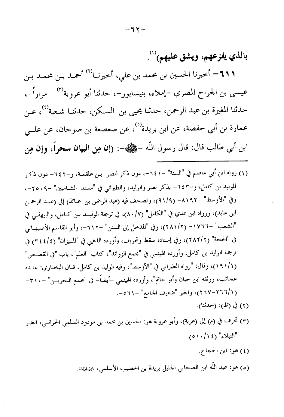 611 - أَخْبَرَنَا الْحُسَيْنُ بْنُ مُحَمَّدِ بْنِ عَلِيٍّ أَخْبَرَنَا أَحْمَدُ بْنُ مُحَمَّدِ بْنِ عِيسَى بْنِ الْجَرَّاحِ الْمِصْرِيُّ إملاء بنيسابورحدثنا أَبُو عَرْوَبَةَ مِرَارًا حَدَّثَنَا الْمُغِيرَةُ بْنُ عَبْدِ الرَّحْمَنِ حَدَّثَنَا يَحْيَى بْنُ السَّكَنِ حَدَّثَنَا شُعْبَةُ عَنْ عِمَارَةَ بْنِ أَبِي حَفْصَةَ عَنِ ابْنِ بُرَيْدَةَ عَنْ صَعْصَعَةَ بْنِ صوحان عَن عَليّ ابْن أَبِي طَالِبٍ قَالَ قَالَ رَسُولُ اللَّهِ صَلَّى اللَّهُ عَلَيْهِ وَسَلَّمَ (إِنَّ مِنَ الْبَيَانِ سِحْرًا وَإِنَّ مِنَ