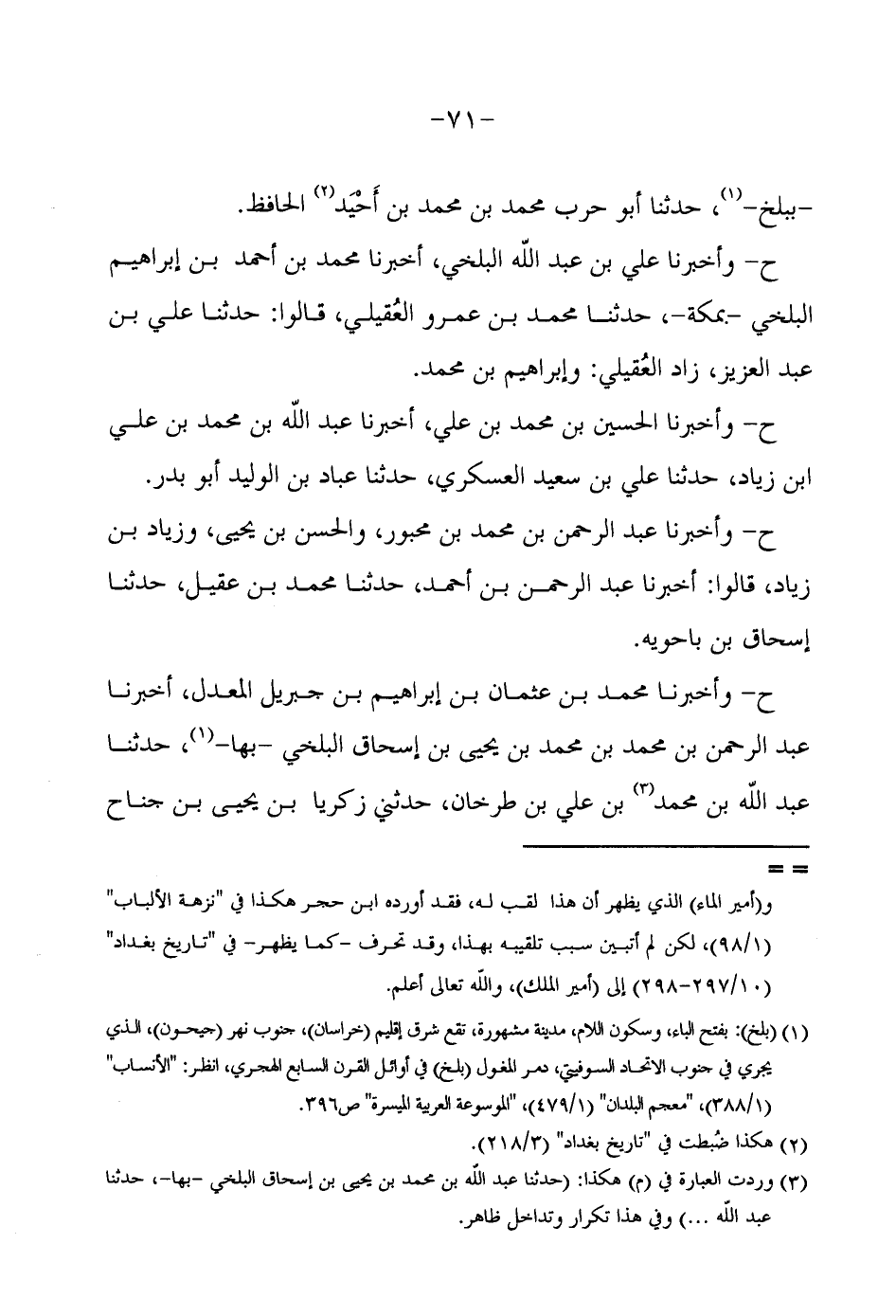 ح وَأَخْبَرَنَا مُحَمَّدُ بْنُ عُثْمَانَ بْنِ إِبْرَاهِيمَ بْنِ جِبْرِيلَ الْمُعَدِّلُ أَخْبَرَنَا عَبْدُ الرَّحْمَنِ بْنُ مُحَمَّدِ بْنِ مُحَمَّدِ بْنِ يَحْيَى بْنِ إِسْحَاقَ الْبَلْخِيُّ بِهَا حَدَّثَنَا عَبْدُ اللَّهِ بْنُ مُحَمَّدِ بْنِ عَلِيِّ بْنِ طَرْخَانَ حَدَّثَنِي زَكَرِيَّا بْنُ يَحْيَى بْنُ جَنَاحٍ