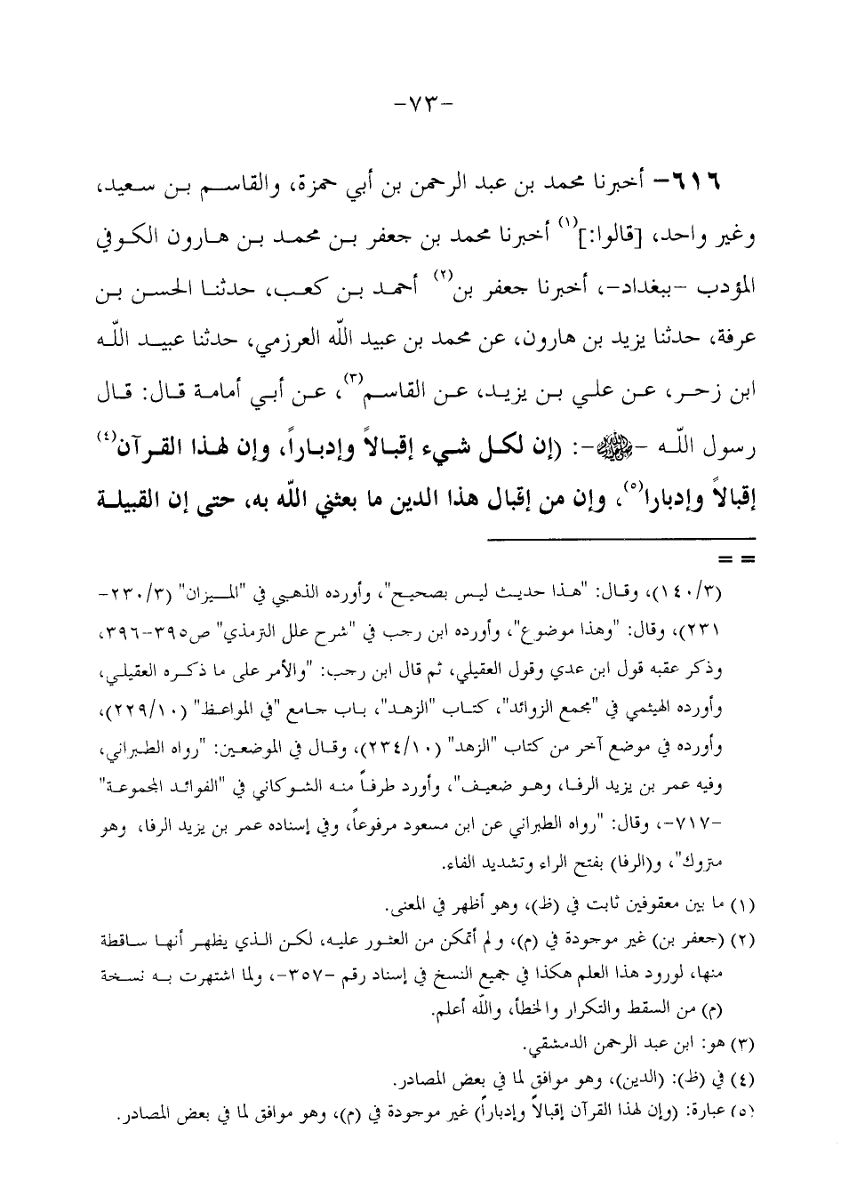 616 - أَخْبَرَنَا مُحَمَّدُ بْنُ عَبْدِ الرَّحْمَنِ بْنِ أَبِي حَمْزَةَ وَالْقَاسِمُ بْنُ سَعِيدٍ وَغَيْرُ وَاحِدٍ قَالُوا أَخْبَرَنَا مُحَمَّدُ بْنُ جَعْفَرِ بْنِ مُحَمَّدِ بْنِ هَارُونَ الْكُوفِيُّ الْمُؤَدَّبُ بِبَغْدَادَ أَخْبَرَنَا جَعْفَرُ بْنُ أَحْمَدَ بْنِ كَعْبٍ حَدَّثَنَا الْحَسَنُ بْنُ عَرَفَةَ حَدَّثَنَا يَزِيدُ بْنُ هَارُونَ عَنْ مُحَمَّدِ بْنِ عُبَيْدِ اللَّهِ الْعَرْزَمِي حَدثنَا عبيد الله ابْنُ زَحْرٍ عَنْ عَلِيِّ بْنِ يَزِيدَ عَنِ الْقَاسِمِ عَنْ أَبِي أُمَامَةَ قَالَ قَالَ رَسُولُ اللَّهِ صَلَّى اللَّهُ عَلَيْهِ وَسَلَّمَ (إِنَّ لِكُلِّ شَيْءٍ إِقْبَالًا وَإِدْبَارًا وَإِنَّ لِهَذَا الْقُرْآنِ إِقْبَالًا وَإِدْبَارًا وَإِنَّ مِنْ إِقْبَالِ هَذَا الدِّينِ مَا بَعَثَنِي اللَّهُ بِهِ حتَّى إِنَّ الْقَبِيلَةَ
