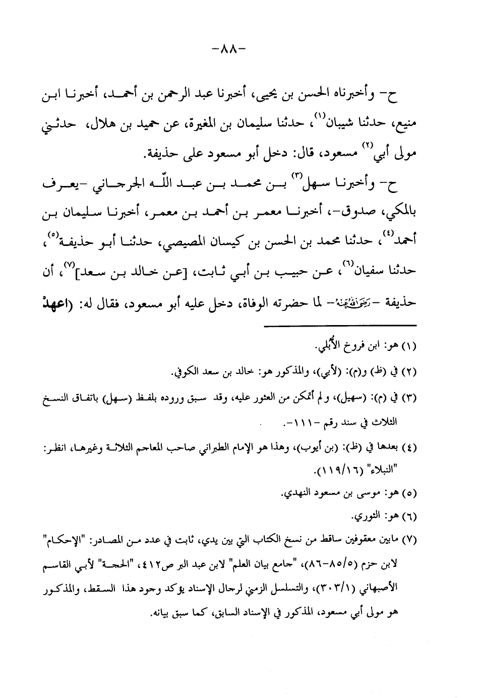 ح وَأَخْبَرَنَا سَهْلُ بْنُ مُحَمَّدِ بْنِ عَبْدِ اللَّهِ الْجُرْجَانِيُّ يُعْرَفُ بِالْمَكِّيِّ صَدُوقٌ أَخْبَرَنَا مَعْمَرُ بْنُ أَحْمَدَ بْنِ مَعْمَرٍ أَخْبَرَنَا سُلَيْمَانُ بْنُ أَحْمَدَ حَدَّثَنَا مُحَمَّدُ بْنُ الْحَسَنِ بْنِ كَيْسَانَ الْمَصِيصِيُّ حَدَّثَنَا أَبُو حُذَيْفَةَ حَدَّثَنَا سُفْيَانُ عَنْ حَبِيبِ بْنِ أَبِي ثَابِتٍ عَنْ خَالِدِ بْنِ سَعْدٍ أَنَّ حُذَيْفَةَ رَضِيَ اللَّهُ عَنْهُ لَمَّا حَضَرَتْهُ الْوَفَاةُ دَخَلَ عَلَيْهِ أَبُو مَسْعُودٍ فَقَالَ لَهُ (اعْهَدْ