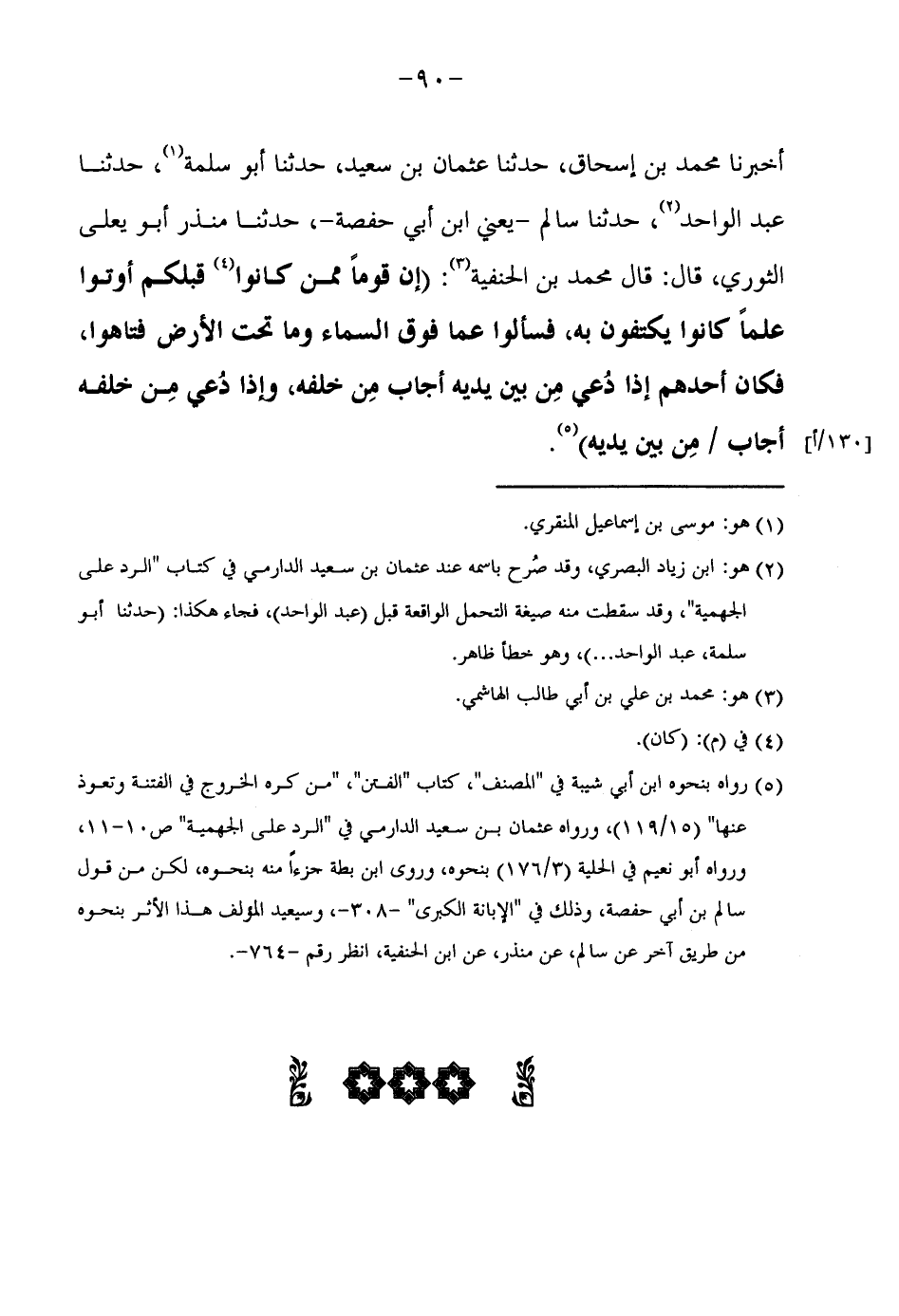 أَخْبَرَنَا مُحَمَّدُ بْنُ إِسْحَاقَ حَدَّثَنَا عُثْمَانُ بْنُ سَعِيدٍ حَدَّثَنَا أَبُو سَلَمَةَ حَدَّثَنَا عَبْدُ الْوَاحِدِ حَدَّثَنَا سَالِمٍ يَعْنِي ابْنَ أَبِي حَفْصَةَ حَدَّثَنَا مُنْذِرٌ أَبُو يَعْلَى الثَّوْرِيُّ قَالَ قَالَ مُحَمَّدُ بْنُ الْحَنَفِيَّةِ (إِنَّ قَوْمًا مِمَّنْ كَانُوا قَبْلَكُمْ أُوتُوا عِلْمًا كَانُوا يَكْتَفُونَ بِهِ فَسَأَلُوا عَمَّا فَوْقَ السَّمَاءِ وَمَا تَحْتَ الْأَرْضِ فَتَاهُوا فَكَانَ أَحَدُهُمْ إِذَا دُعِيَ مِنْ بَيْنِ يَدَيْهِ أَجَابَ مِنْ خَلْفِهِ وَإِذَا دُعِيَ مِنْ خَلْفِهِ أَجَابَ مِنْ بَيْنِ يَدَيْهِ) رَوَاهُ بِنَحْوِهِ ابْن أبي شيبَة فِي المُصَنّف كتاب الْفِتَن من كره الْخُرُوج من الْفِتْنَة وتعوذ