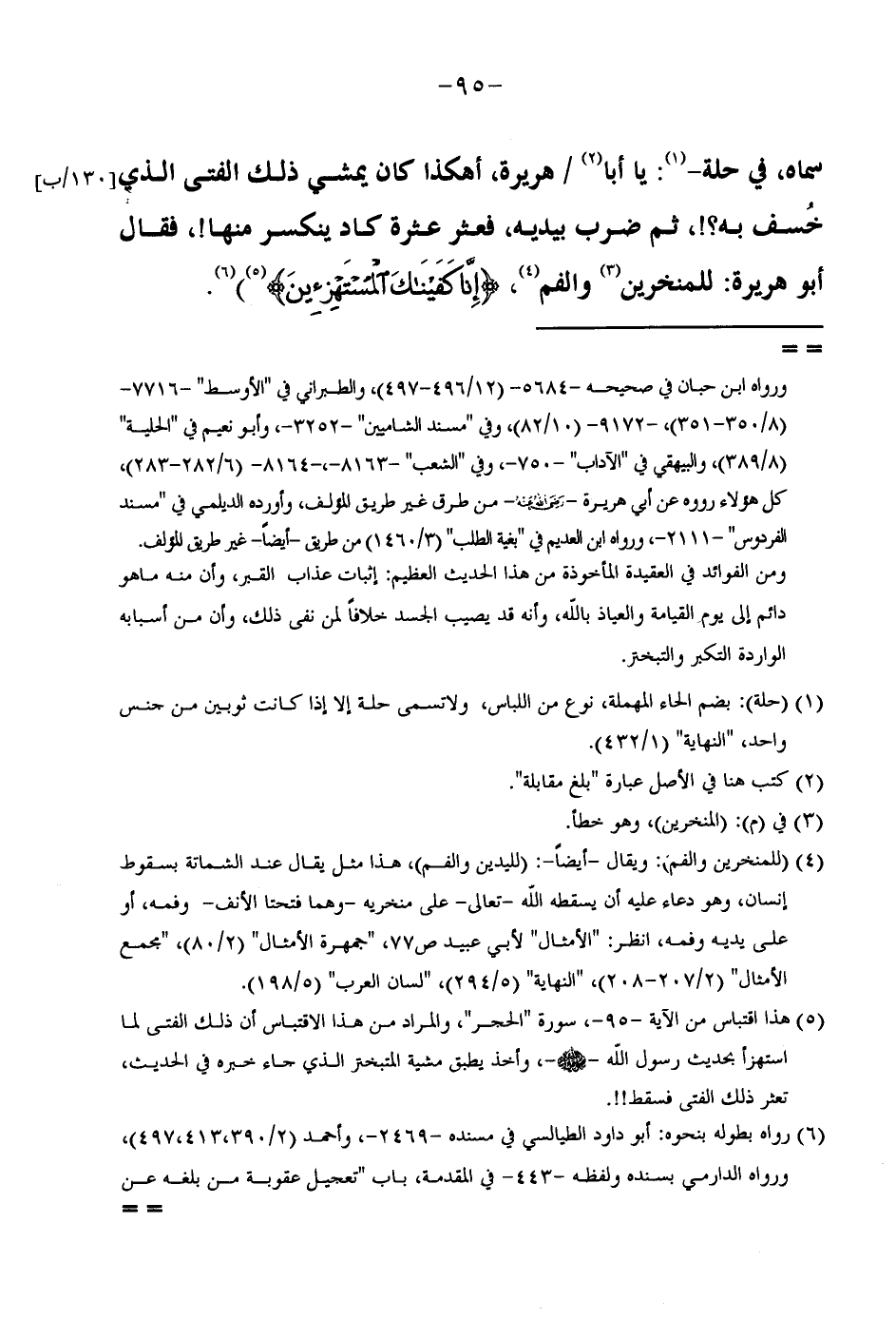 سَمَّاهُ فِي حُلَّةٍ يَا أَبَا هُرَيْرَةَ أَهَكَذَا كَانَ يَمْشِي ذَلِكَ الْفَتَى الَّذِي خُسِفَ بِهِ ثُمَّ ضَرَبَ بِيَدَيْهِ فَعَثِرَ عَثْرَةً كَادَ يَنْكَسِرَ مِنْهَا فَقَالَ أَبُو هُرَيْرَةَ لِلْمِنْخَرَيْنِ وَالْفَمِ {إِنَّا كَفَيْنَاكَ الْمُسْتَهْزِئِينَ} ) // رَوَاهُ بِطُولِهِ بِنَحْوِهِ أَبُو دَاوُد الطَّيَالِسِيّ فِي مُسْنده وَأحمد //