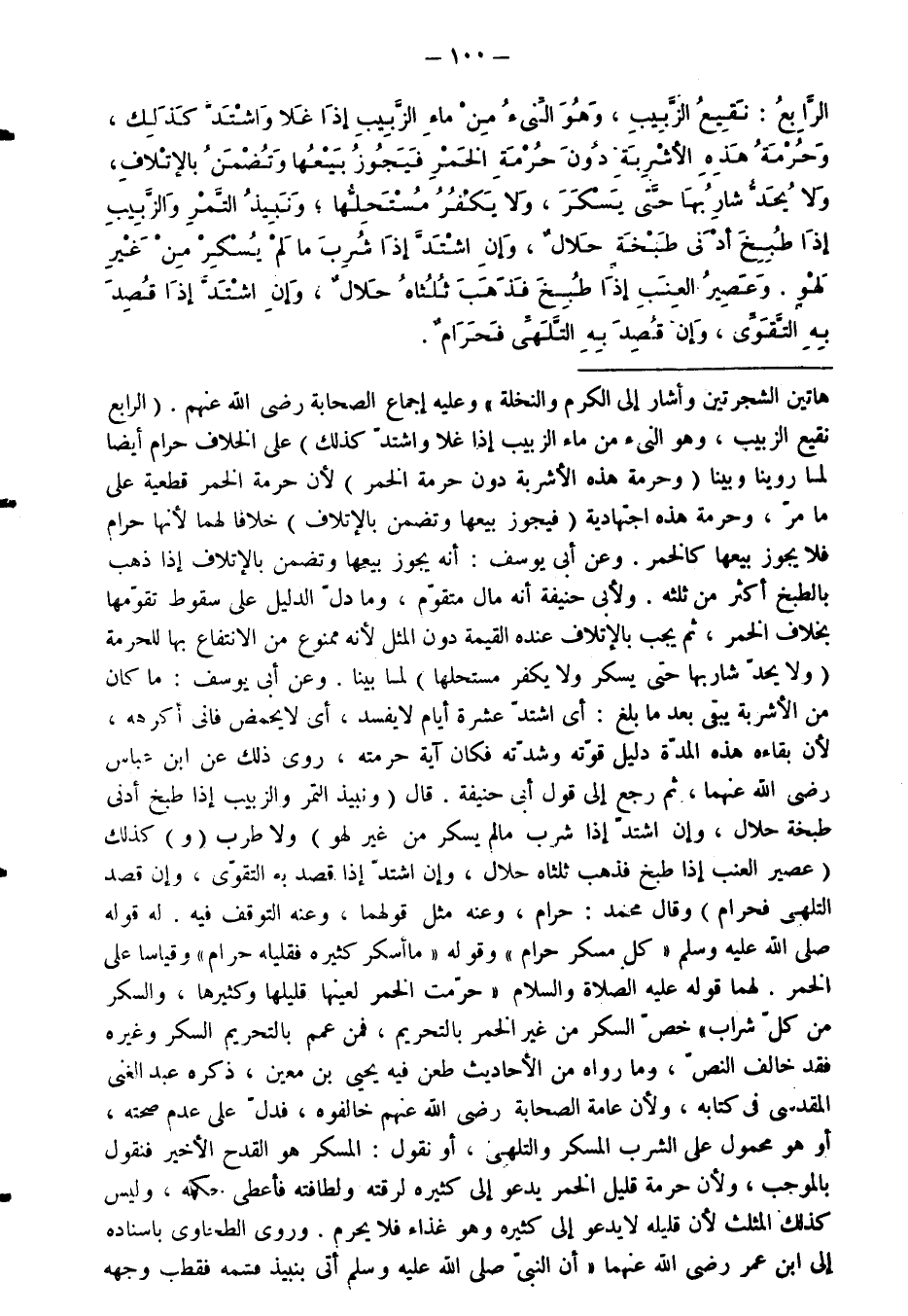 الرَّابِعُ: نَقِيعُ الزَّبِيبِ، وَهُوَ النِّيءُ مِنْ مَاءِ الزَّبِيبِ إِذَا غَلَا وَاشْتَدَّ كَذَلِكَ، وَحُرْمَةُ هَذِهِ الْأَشْرِبَةِ دُونَ حُرْمَةِ الْخَمْرِ فَيَجُوزُ بَيْعُهَا وَتُضْمَنُ بِالْإِتْلَافِ، وَلَا يُحَدُّ شَارِبُهَا حَتَّى يَسْكَرَ، وَلَا يَكْفُرُ مُسْتَحِلُّهَا؛ وَنَبِيذُ التَّمْرِ وَالزَّبِيبِ إِذَا طُبِخَ أَدْنَى طَبْخَةٍ حَلَالٌ، وَإِنِ اشْتَدَّ إِذَا شُرِبَ مَا لَمْ يُسْكِرْ مِنْ غَيْرِ لَهْوٍ. وَعَصِيرُ الْعِنَبِ إِذَا طُبِخَ فَذَهَبَ ثُلُثَاهُ حَلَالٌ، وَإِنِ اشْتَدَّ إِذَا قُصِدَ بِهِ التَّقَوِّي، وَإِنْ قُصِدَ بِهِ التَّلَهِّي فَحَرَامٌ.