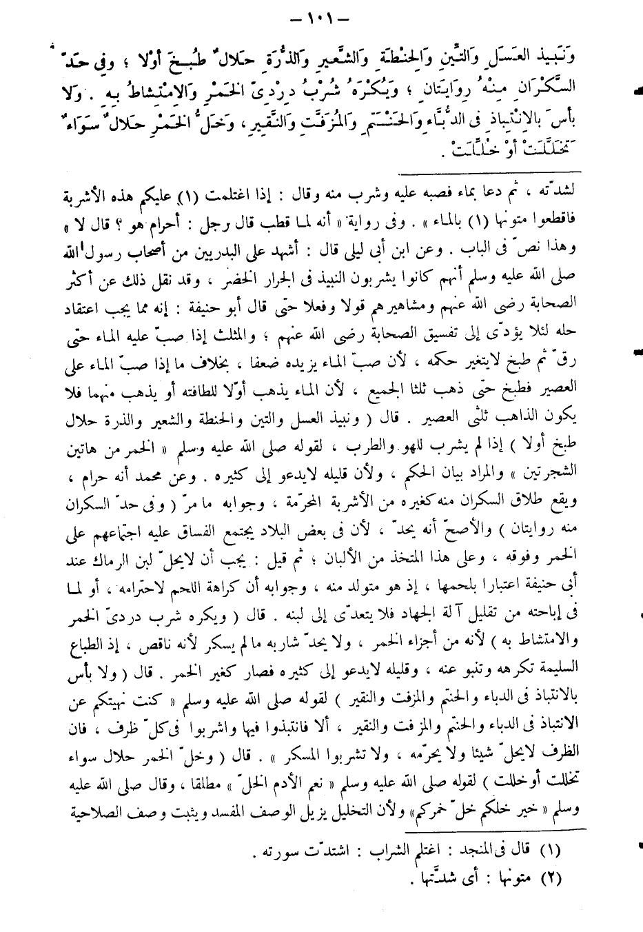 ـــــــــــــــــــــــــــــQلِشِدَّتِهِ، ثُمَّ دَعَا بِمَاءٍ فَصَبَّهُ عَلَيْهِ وَشَرِبَ مِنْهُ وَقَالَ: إِذَا اغْتَلَمَتْ عَلَيْكُمْ هَذِهِ الْأَشْرِبَةُ فَاقْطَعُوا مُتُونَهَا بِالْمَاءِ» ؛ وَفِي رِوَايَةٍ: «أَنَّهُ لَمَّا قَطَّبَ قَالَ رَجُلٌ: " أَحْرَامٌ هُوَ؟ قَالَ لَا» وَهَذَا نَصٌّ فِي الْبَابِ. وَعَنِ ابْنِ أَبِي لَيْلَى قَالَ: أَشْهَدُ عَلَى الْبَدْرِيِّينَ مِنْ أَصْحَابِ رَسُولِ اللَّهِ - صَلَّى اللَّهُ عَلَيْهِ وَسَلَّمَ - أَنَّهُمْ كَانُوا يَشْرَبُونَ النَّبِيذَ فِي الْجِرَارِ الْخُضْرِ، وَقَدْ نُقِلَ ذَلِكَ عَنْ أَكْثَرِ الصَّحَابَةِ - رَضِيَ اللَّهُ عَنْهُمْ - وَمَشَاهِيرِهِمْ قَوْلًا وَفِعْلًا حَتَّى قَالَ أَبُو حَنِيفَةَ: إِنَّهُ مِمَّا يَجِبُ اعْتِقَادُ حَلِّهِ لِئَلَّا يُؤَدِّيَ إِلَى تَفْسِيقِ الصَّحَابَةِ - رَضِيَ اللَّهُ عَنْهُمْ -.