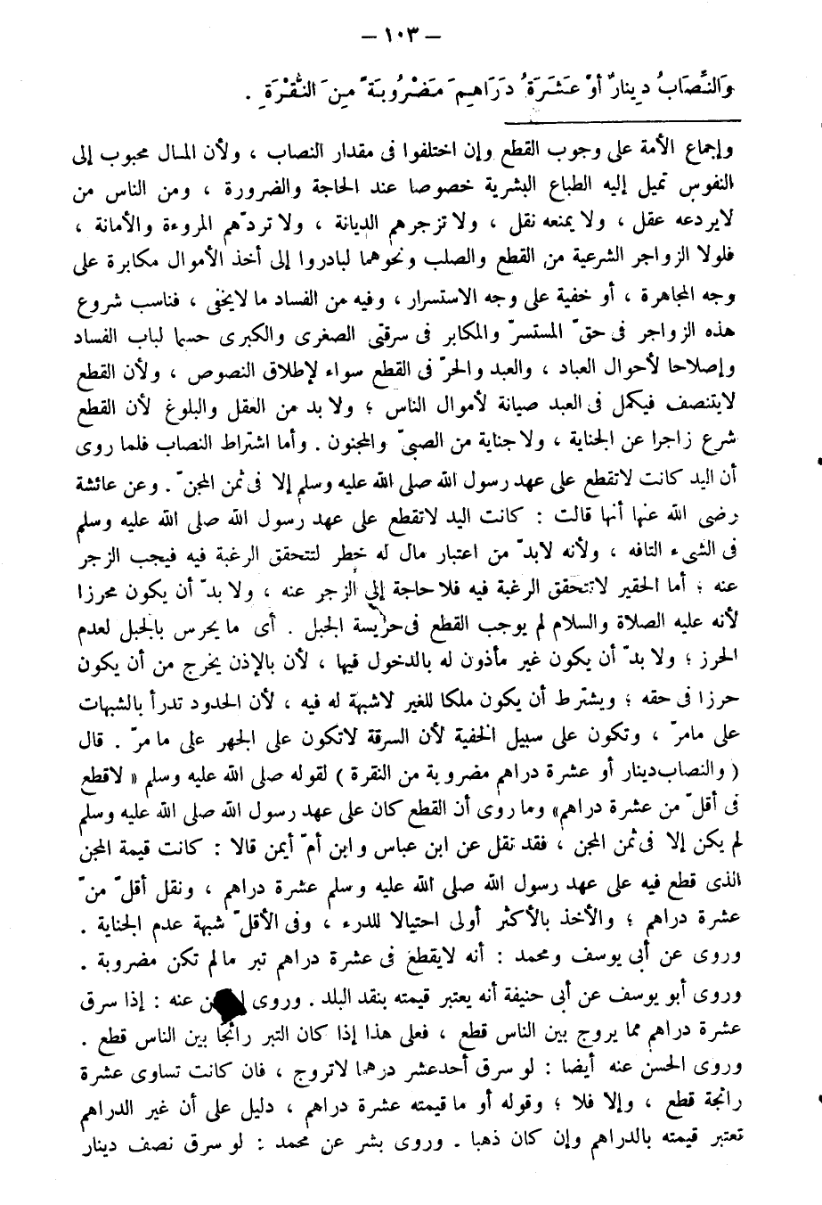 قَالَ: (وَالنِّصَابُ دِينَارٌ أَوْ عَشَرَةُ دَرَاهِمَ مَضْرُوبَةٍ مِنَ النَّقْرَةِ) لِقَوْلِهِ - صَلَّى اللَّهُ عَلَيْهِ وَسَلَّمَ -: «لَا قَطْعَ فِي أَقَلَّ مِنْ عَشَرَةِ دَرَاهِمَ» وَمَا رُوِيَ أَنَّ الْقَطْعَ كَانَ عَلَى عَهْدِ رَسُولِ اللَّهِ - صَلَّى اللَّهُ عَلَيْهِ وَسَلَّمَ - لَمْ يَكُنْ إِلَّا فِي ثَمَنِ الْمِجَنِّ؛ فَقَدْ نُقِلَ «عَنِ ابْنِ عَبَّاسٍ وَابْنِ أُمِّ أَيْمَنَ قَالَا: كَانَتْ قِيمَةُ الْمِجَنِّ الَّذِي قُطِعَ فِيهِ عَلَى عَهْدِ رَسُولِ اللَّهِ - صَلَّى اللَّهُ عَلَيْهِ وَسَلَّمَ - عَشَرَةَ دَرَاهِمَ» ، وَنُقِلَ أَقَلُّ مِنْ عَشَرَةِ دَرَاهِمَ؛ وَالْأَخْذُ بِالْأَكْثَرِ أَوْلَى احْتِيَالًا لِلدَّرْءِ، وَفِي الْأَقَلِّ شُبْهَةُ عَدَمِ الْجِنَايَةِ. وَرُوِيَ عَنْ أَبِي يُوسُفَ وَمُحَمَّدٍ: أَنَّهُ لَا يَقْطَعُ فِي عَشَرَةِ دَرَاهِمَ تِبْرٍ مَا لَمْ تَكُنْ مَضْرُوبَةً. وَرَوَى أَبُو يُوسُفَ عَنْ أَبِي حَنِيفَةَ أَنَّهُ يُعْتَبَرُ قِيمَتُهُ بِنَقْدِ الْبَلَدِ. وَرَوَى الْحَسَنُ عَنْهُ: إِذَا سَرَقَ عَشَرَةَ دَرَاهِمَ مِمَّا يُرَوَّجُ بَيْنَ النَّاسِ قُطِعَ، فَعَلَى هَذَا إِذَا كَانَ التِّبْرُ رَائِجًا بَيْنَ النَّاسِ قُطِعَ. وَرَوَى الْحَسَنُ عَنْهُ أَيْضًا: لَوْ سَرَقَ أَحَدَ عَشَرَ دِرْهَمًا لَا تُرَوَّجُ، فَإِنْ كَانَتْ تُسَاوِي عَشْرَةً رَائِجَةً قُطِعَ، وَإِلَّا فَلَا.
