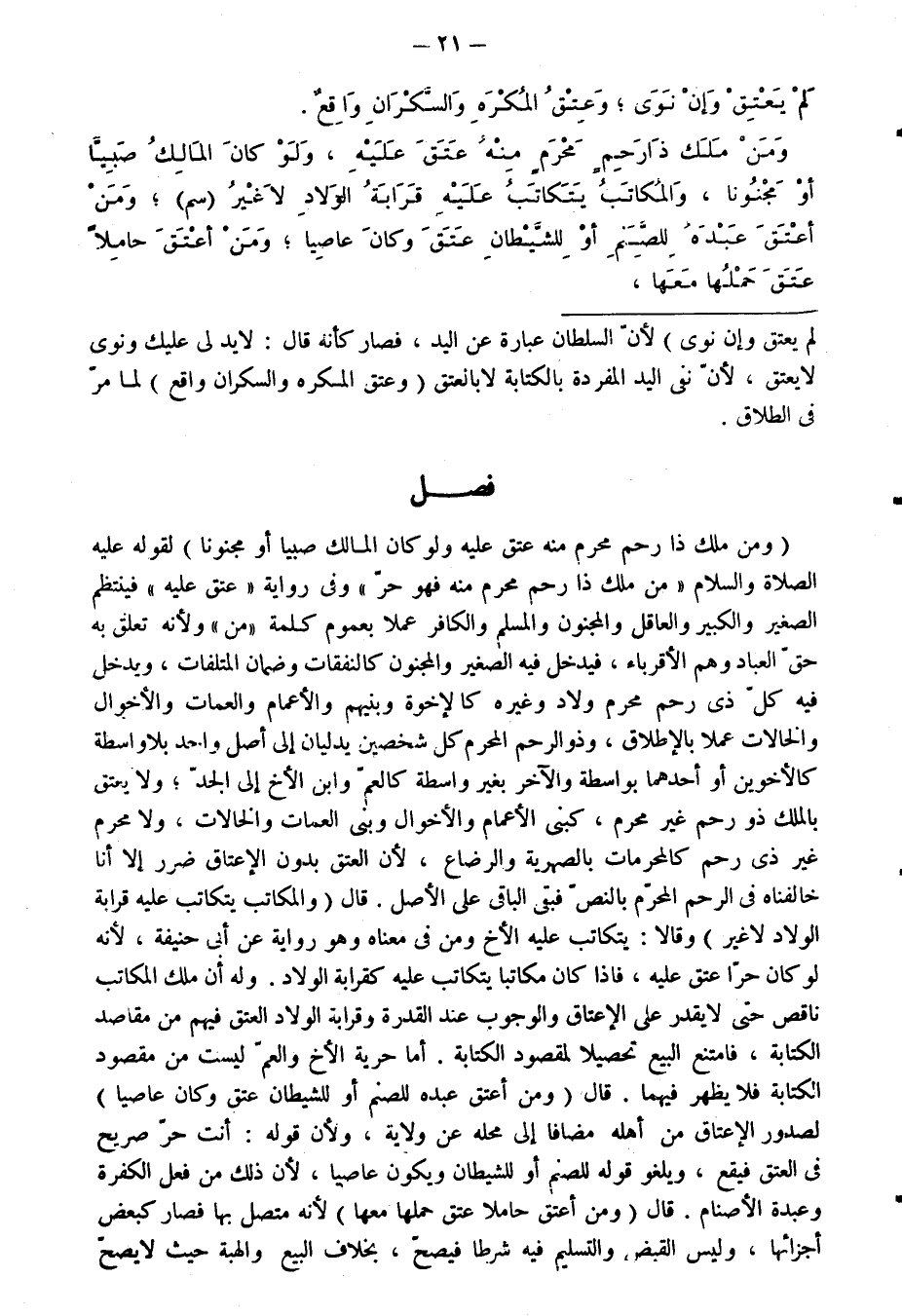 فَصْلٌ (وَمَنْ مَلَكَ ذَا رَحِمِ مَحْرَمٍ مِنْهُ عَتَقَ عَلَيْهِ وَلَوْ كَانَ الْمَالِكُ صَبِيًّا أَوْ مَجْنُونًا) لِقَوْلِهِ - عَلَيْهِ الصَّلَاةُ وَالسَّلَامُ -: «مَنْ مَلَكَ ذَا رَحِمٍ مَحْرَمٍ مِنْهُ فَهُوَ حُرٌّ» ، وَفِي رِوَايَةٍ: " عَتَقَ عَلَيْهِ "، فَيَنْتَظِمُ الصَّغِيرَ وَالْكَبِيرَ وَالْعَاقِلَ وَالْمَجْنُونَ وَالْمُسْلِمَ وَالْكَافِرَ عَمَلًا بِعُمُومِ كَلِمَةِ " مَنْ " وَلِأَنَّهُ تَعَلَّقَ بِهِ حَقُّ الْعِبَادِ وَهُمُ الْأَقْرِبَاءُ، فَيَدْخُلُ فِيهِ الصَّغِيرُ وَالْمَجْنُونُ كَالنَّفَقَاتِ وَضَمَانِ الْمُتْلَفَاتِ، وَيَدْخُلُ فِيهِ كُلُّ ذِي رَحِمِ مَحْرَمٍ وِلَادٌ وَغَيْرُهُ كَالْإِخْوَةِ وَبَنِيهِمْ وَالْأَعْمَامِ وَالْعَمَّاتِ وَالْأَخْوَالِ وَالْخَالَاتِ عَمَلًا بِالْإِطْلَاقِ، وَذُو الرَّحِمِ الْمَحْرَمِ كُلُّ شَخْصَيْنِ يُدْلِيَانِ إِلَى أَصْلٍ وَاحِدٍ بِلَا وَاسِطَةٍ كَالْأَخَوَيْنِ. أَوْ أَحَدُهُمَا بِوَاسِطَةٍ وَالْآخَرُ بِغَيْرِ وَاسِطَةٍ كَالْعَمِّ وَابْنِ الْأَخِ إِلَى الْجَدِّ، وَلَا يَعْتِقُ بِالْمِلْكِ ذُو رَحِمٍ غَيْرُ مَحْرَمٍ، كَبَنِي الْأَعْمَامِ وَالْأَخْوَالِ وَبَنِي الْعَمَّاتِ وَالْخَالَاتِ، وَلَا مَحْرَمٌ غَيْرُ ذِي رَحِمٍ كَالْمُحَرَّمَاتِ بَالصِّهْرِيَّةِ وَالرَّضَاعِ، لِأَنَّ الْعِتْقَ بِدُونِ الْإِعْتَاقِ ضَرَرٌ إِلَّا أَنَّا خَالَفْنَاهُ فِي الرَّحِمِ الْمَحْرَمِ بِالنَّصِّ فَبَقِيَ الْبَاقِي عَلَى الْأَصْلِ.