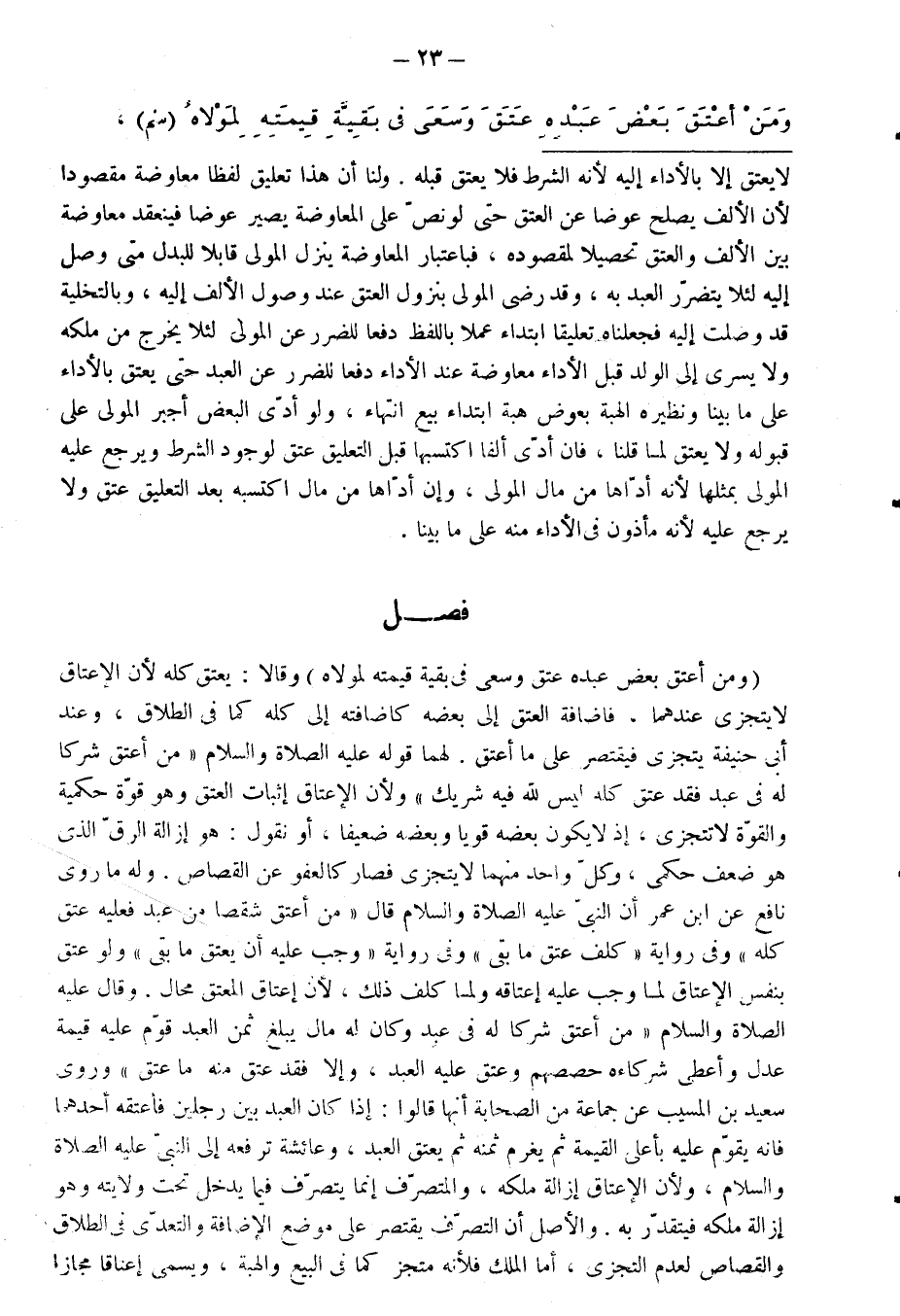 فَصْلٌ (وَمَنْ أَعْتَقَ بَعْضَ عَبْدِهِ عَتَقَ وَسَعَى فِي بَقِيَّةِ قِيمَتِهِ لِمَوْلَاهُ) ، وَقَالَا: يَعْتِقُ كُلُّهُ لِأَنَّ الْإِعْتَاقَ لَا يَتَجَزَّأُ عِنْدَهُمَا، فَإِضَافَةُ الْعِتْقِ إِلَى بَعْضِهِ كَإِضَافَتِهِ إِلَى كُلِّهِ كَمَا فِي الطَّلَاقِ، وَعِنْدَ أَبِي حَنِيفَةَ يَتَجَزَّأُ فَيَقْتَصِرُ عَلَى مَا أَعْتَقَ. لَهُمَا قَوْلُهُ - عَلَيْهِ الصَّلَاةُ وَالسَّلَامُ -: «مَنْ أَعْتَقَ شِرْكًا لَهُ فِي عَبْدٍ فَقَدْ عَتَقَ كُلُّهُ لَيْسَ لِلَّهِ فِيهِ شَرِيكٌ» ، وَلِأَنَّ الْإِعْتَاقَ إِثْبَاتُ الْعِتْقِ وَهُوَ قُوَّةٌ حُكْمِيَّةٌ وَالْقُوَّةُ لَا تَتَجَزَّأُ، إِذْ لَا يَكُونُ بَعْضُهُ قَوِيًّا وَبَعْضُهُ ضَعِيفًا، أَوْ نَقُولُ: هُوَ إِزَالَةُ الرِّقِّ الَّذِي هُوَ ضَعْفٌ حُكْمِيٌّ، وَكُلُّ وَاحِدٍ مِنْهُمَا لَا يَتَجَزَّأُ فَصَارَ كَالْعَفْوِ عَنِ الْقِصَاصِ. وَلَهُ مَا رَوَى نَافِعٌ عَنِ ابْنِ عُمَرَ أَنَّ النَّبِيَّ - عَلَيْهِ الصَّلَاةُ وَالسَّلَامُ - قَالَ: «مَنْ أَعْتَقَ شِقْصًا مِنْ عَبْدٍ فَعَلَيْهِ عِتْقُ كُلِّهِ. وَفِي رِوَايَةٍ: كُلِّفَ عِتْقَ مَا بَقِيَ. وَفِي رِوَايَةٍ: وَجَبَ عَلَيْهِ أَنْ يَعْتِقَ مَا بَقِيَ» ، وَلَوْ عَتَقَ بِنَفْسِ الْإِعْتَاقِ لَمَا وَجَبَ عَلَيْهِ إِعْتَاقُهُ وَلَمَا كُلِّفَ ذَلِكَ، لِأَنَّ إِعْتَاقَ الْمُعْتَقِ مُحَالٌ. وَقَالَ - عَلَيْهِ الصَّلَاةُ وَالسَّلَامُ -: «مَنْ أَعْتَقَ شِرْكًا لَهُ فِي عَبْدٍ وَكَانَ لَهُ مَالٌ يَبْلُغُ ثَمَنَ الْعَبْدِ قُوِّمَ عَلَيْهِ قِيمَةَ عَدْلٍ وَأَعْطَى شُرَكَاءَهَ حِصَصَهُمْ وَعَتَقَ عَلَيْهِ الْعَبْدُ، وَإِلَّا فَقَدَ عَتَقَ مِنْهُ مَا عَتَقَ» ، وَرَوَى سَعِيدُ بْنُ الْمُسَيِّبِ عَنْ جَمَاعَةٍ مِنَ الصَّحَابَةِ أَنَّهُمْ قَالُوا: إِذَا كَانَ الْعَبْدُ بَيْنَ رَجُلَيْنِ فَأَعْتَقَهُ أَحَدُهُمَا فَإِنَّهُ يُقَوَّمُ عَلَيْهِ بِأَعْلَى الْقِيمَةِ، ثُمَّ يَغْرُمُ ثَمَنَهُ، ثُمَّ يَعْتِقُ الْعَبْدُ، وَعَائِشَةُ تَرْفَعُهُ إِلَى النَّبِيِّ - عَلَيْهِ الصَّلَاةُ وَالسَّلَامُ -، وَلِأَنَّ الْإِعْتَاقَ إِزَالَةُ مِلْكِهِ، وَالْمُتَصَرِّفُ إِنَّمَا يَتَصَرَّفُ فِيمَا يَدْخُلُ تَحْتَ وَلَايَتِهِ وَهُوَ إِزَالَةُ مِلْكِهِ فَيَتَقَدَّرُ بِهِ.