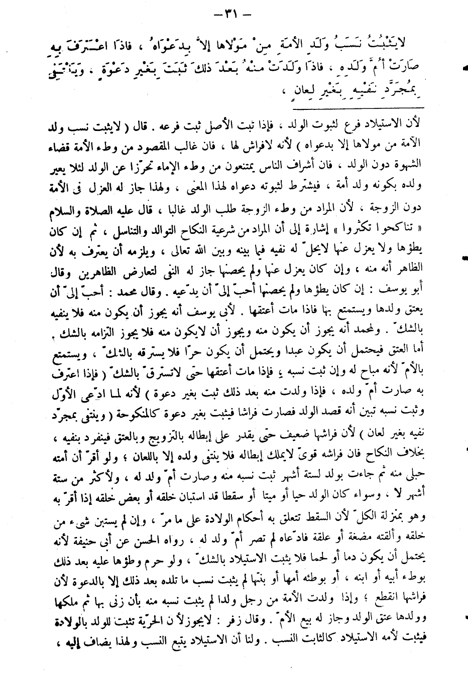 قَالَ: (لَا يَثْبُتُ نَسَبُ وَلَدِ الْأَمَةِ مِنْ مَوْلَاهَا إِلَّا بِدَعْوَاهُ) لِأَنَّهُ لَا فِرَاشَ لَهَا، فَإِنَّ غَالِبَ الْمَقْصُودِ مِنْ وَطْءِ الْأَمَةِ قَضَاءُ الشَّهْوَةِ دُونَ الْوَلَدِ، فَإِنَّ أَشْرَافَ النَّاسِ يَمْتَنِعُونَ مِنْ وَطْءِ الْإِمَاءِ تَحَرُّزًا عَنِ الْوَلَدِ لِئَلَّا يُعَيَّرَ وَلَدُهُ بِكَوْنِهِ وَلَدَ أَمَةٍ، فَيُشْتَرَطُ لِثُبُوتِهِ دَعْوَاهُ لِهَذَا الْمَعْنَى، وَلِهَذَا جَازَ لَهُ الْعَزْلُ فِي الْأَمَةِ دُونَ الزَّوْجَةِ، لِأَنَّ الْمُرَادَ مِنْ وَطْءِ الزَّوْجَةِ طَلَبُ الْوَلَدِ غَالِبًا، قَالَ - عَلَيْهِ الصَّلَاةُ وَالسَّلَامُ -: «تَنَاكَحُوا تَكْثُرُوا» إِشَارَةً إِلَى أَنَّ الْمُرَادَ مِنْ شَرْعِيَّةِ النِّكَاحِ التَّوَالُدُ وَالتَّنَاسُلُ، ثُمَّ إِنْ كَانَ يَطَؤُهَا وَلَا يَعْزِلُ عَنْهَا لَا يَحِلُّ لَهُ نَفْيُهُ فِيمَا بَيْنَهُ وَبَيْنَ اللَّهِ تَعَالَى، وَيَلْزَمُهُ أَنْ يَعْتَرِفَ بِهِ لِأَنَّ الظَّاهِرَ أَنَّهُ مِنْهُ، وَإِنْ كَانَ يَعْزِلُ عَنْهَا وَلَمْ يُحَصِّنْهَا جَازَ لَهُ النَّفْيُ لِتَعَارُضِ الظَّاهِرَيْنِ، وَقَالَ أَبُو يُوسُفَ: إِنْ كَانَ يَطَؤُهَا وَلَمْ يُحَصِّنْهَا أَحَبُّ إِلَيَّ أَنْ يَدَّعِيَهُ. وَقَالَ مُحَمَّدٌ: أَحَبُّ إِلَيَّ أَنْ يَعْتِقَ وَلَدُهَا وَيَسْتَمْتِعَ بِهَا فَإِذَا مَاتَ أَعْتَقَهَا. لِأَبِي يُوسُفَ أَنَّهُ يَجُوزُ أَنْ يَكُونَ مِنْهُ فَلَا يَنْفِيهِ بِالشَّكِّ.