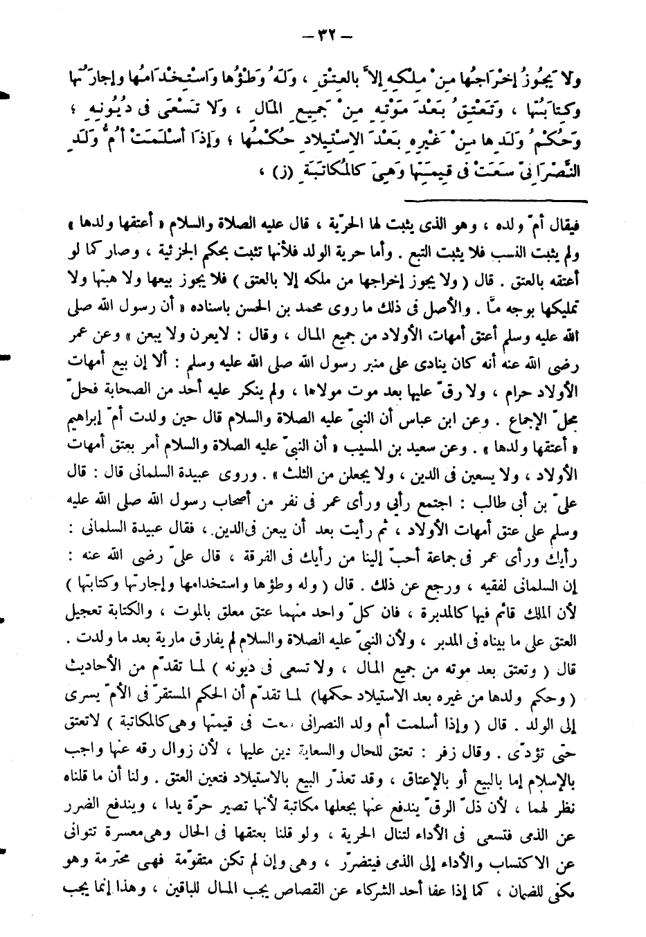 وَالْأَصْلُ فِي ذَلِكَ مَا رَوَى مُحَمَّدُ بْنُ الْحَسَنِ بِإِسْنَادِهِ «أَنَّ رَسُولَ اللَّهِ - صَلَّى اللَّهُ عَلَيْهِ وَسَلَّمَ - أَعْتَقَ أُمَّهَاتِ الْأَوْلَادِ مِنْ جَمِيعِ الْمَالِ، وَقَالَ: لَا يُعَرْنَ وَلَا يُبَعْنَ» ، وَعَنْ عُمَرَ - رَضِيَ اللَّهُ عَنْهُ - أَنَّهُ كَانَ يُنَادِي عَلَى مِنْبَرِ رَسُولِ اللَّهِ - صَلَّى اللَّهُ عَلَيْهِ وَسَلَّمَ -: أَلَا إِنَّ بَيْعَ أُمَّهَاتِ الْأَوْلَادِ حَرَامٌ، وَلَا رِقَّ عَلَيْهَا بَعْدَ مَوْتِ مَوْلَاهَا، وَلَمْ يُنْكِرْ عَلَيْهِ أَحَدٌ مِنَ الصَّحَابَةِ فَحَلَّ مَحَلَّ الْإِجْمَاعِ. وَعَنِ ابْنِ عَبَّاسٍ «أَنَّ النَّبِيَّ - عَلَيْهِ الصَّلَاةُ وَالسَّلَامُ - قَالَ حِينَ وَلَدَتْ أُمُّ إِبْرَاهِيمَ: أَعْتَقَهَا وَلَدُهَا» . وَعَنْ سَعِيدِ بْنِ الْمُسَيِّبِ: «أَنَّ النَّبِيَّ - عَلَيْهِ الصَّلَاةُ وَالسَّلَامُ - أَمَرَ بِعِتْقِ أُمَّهَاتِ الْأَوْلَادِ، وَلَا يَسْعَيْنَ فِي الدَّيْنِ، وَلَا يُجْعَلْنَ مِنَ الثُّلُثِ» . وَرَوَى عَبِيدَةُ السَّلْمَانِيُّ قَالَ: قَالَ عَلِيُّ بْنُ أَبِي طَالِبٍ: اجْتَمَعَ رَأْيِي وَرَأْيُ عُمَرَ فِي نَفَرٍ مِنْ أَصْحَابِ رَسُولِ اللَّهِ - صَلَّى اللَّهُ عَلَيْهِ وَسَلَّمَ - عَلَى عِتْقِ أُمَّهَاتِ الْأَوْلَادِ، ثُمَّ رَأَيْتُ بَعْدُ أَنْ يُبَعْنَ فِي الدَّيْنِ، فَقَالَ عَبِيدَةُ السَّلْمَانِيُّ: رَأْيُكَ وَرَأْيُ عُمَرَ فِي جَمَاعَةٍ أَحَبُّ إِلَيْنَا مِنْ رَأْيِكَ فِي الْفُرْقَةِ، قَالَ عَلِيٌّ - رَضِيَ اللَّهُ عَنْهُ -: إِنَّ السَّلْمَانِيَّ لَفَقِيهٌ، وَرَجَعَ عَنْ ذَلِكَ.