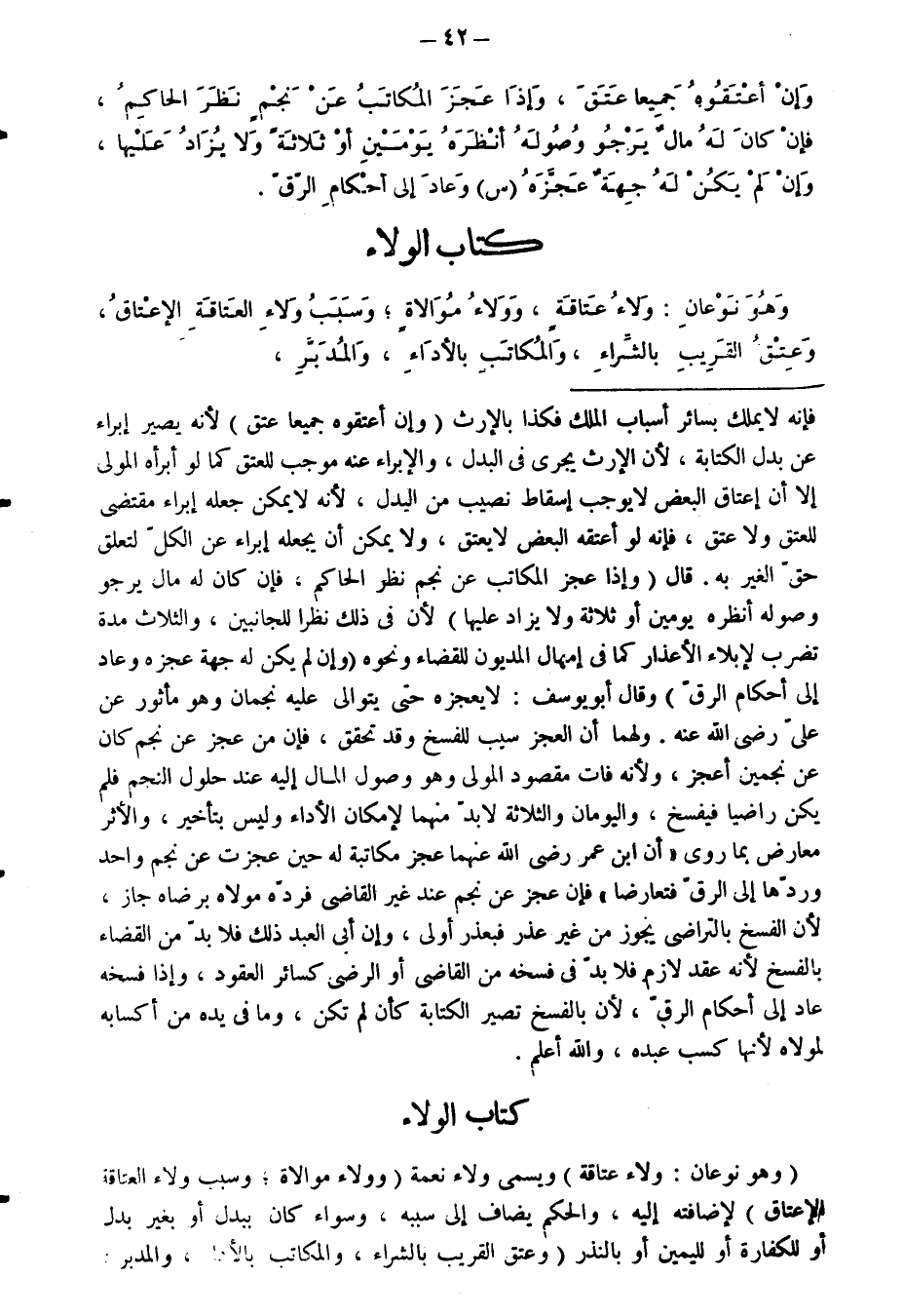 كِتَابُ الْوَلَاءِ وَهُوَ نَوْعَانِ: وَلَاءُ عَتَاقَةٍ، وَوَلَاءُ مُوَالَاةٍ، وَسَبَبُ وَلَاءِ الْعَتَاقَةِ الْإِعْتَاقُ، وَعِتْقُ الْقَرِيبِ بِالشِّرَاءِ، وَالْمُكَاتَبِ بِالْأَدَاءِ، وَالْمُدَبَّرِ،