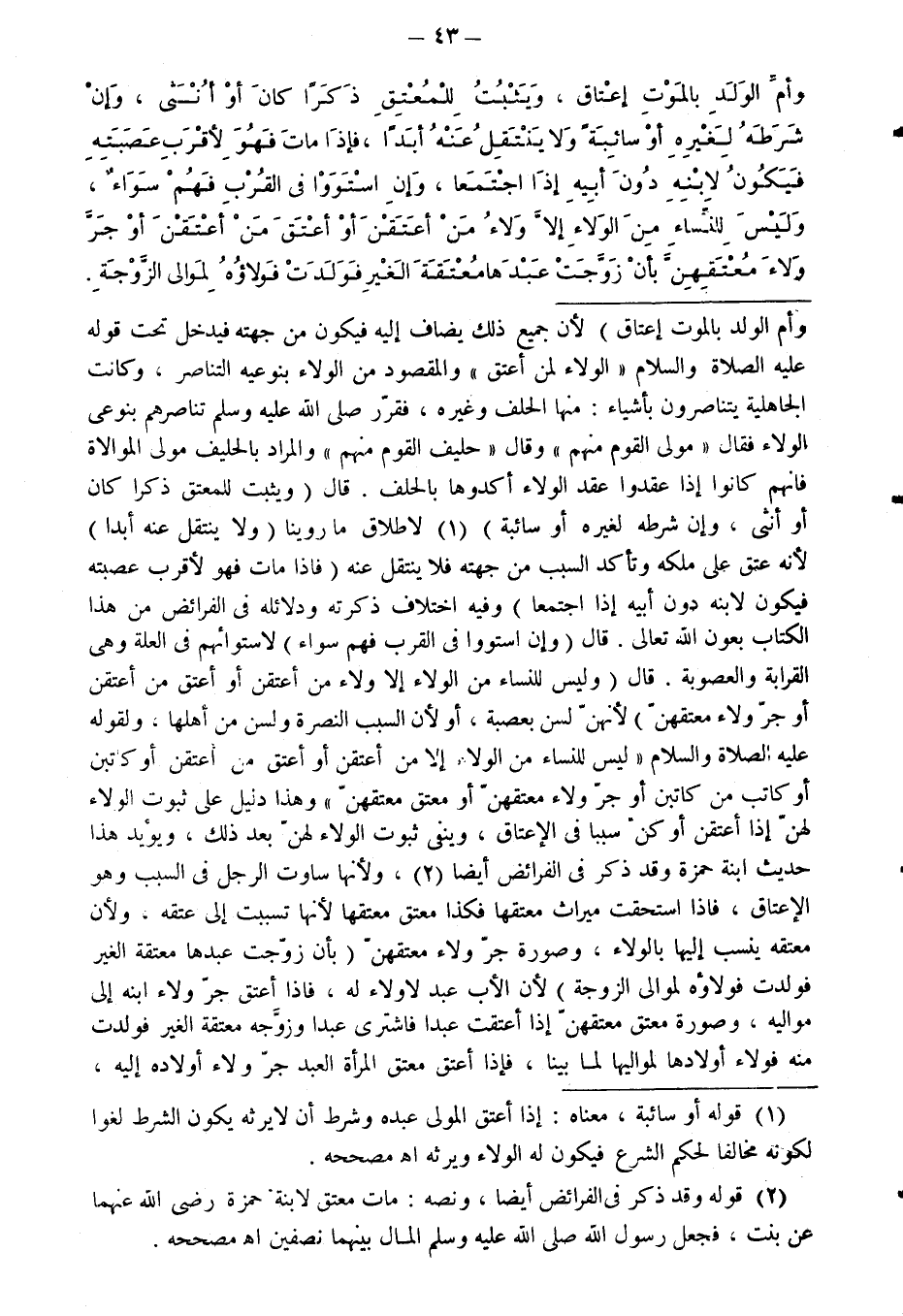 وَأُمِّ الْوَلَدِ بِالْمَوْتِ إِعْتَاقٌ، وَيَثْبُتُ لِلْمُعْتِقِ ذَكَرًا كَانَ أَوْ أُنْثَى، وَإِنْ شَرَطَهُ لِغَيْرِهِ أَوْ سَائِبَةً وَلَا يَنْتَقِلُ عَنْهُ أَبَدًا، فَإِذَا مَاتَ فَهُوَ لِأَقْرَبِ عَصَبَتِهُ فَيَكُونُ لِابْنِهِ دُونَ أَبِيهِ إِذَا اجْتَمَعَا، وَإِنِ اسْتَوَوْا فِي الْقُرْبِ فَهُمْ سَوَاءٌ، وَلَيْسَ لِلنِّسَاءِ مِنَ الْوَلَاءِ إِلَّا وَلَاءُ مَنْ أَعَتَقْنَ أَوْ أَعْتَقَ مَنْ أَعْتَقْنَ أَوْ جَرَّ وَلَاءَ مُعْتِقِهِنَّ بِأَنْ زَوَّجَتْ عَبْدَهَا مُعْتَقَةَ الْغَيْرِ فَوَلَدَتْ فَوَلَاؤُهُ لِمَوَالِي الزَّوْجَةِ.