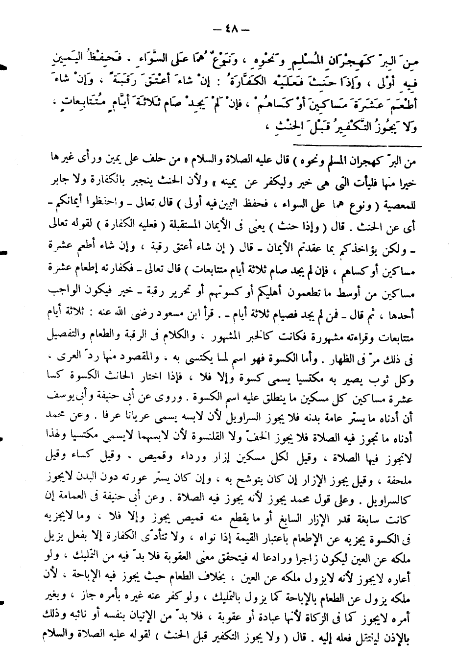 وَأَمَّا الْكِسْوَةُ فَهُوَ اسْمٌ لِمَا يُكْتَسَى بِهِ، وَالْمَقْصُودُ مِنْهَا رَدُّ الْعُرْيِ، وَكُلُّ ثَوْبٍ يَصِيرُ بِهِ مُكْتَسِيًا يُسَمَّى كِسْوَةً وَإِلَّا فَلَا، فَإِذَا اخْتَارَ الْحَانِثُ الْكِسْوَةَ كَسَا عَشَرَةَ مَسَاكِينَ كُلَّ مِسْكِينٍ مَا يَنْطَلِقُ عَلَيْهِ اسْمُ الْكِسْوَةِ. وَرُوِيَ عَنْ أَبِي حَنِيفَةَ وَأَبِي يُوسُفَ أَنَّ أَدْنَاهُ مَا يَسْتُرُ عَامَّةَ بَدَنِهِ فَلَا يَجُوزُ السَّرَاوِيلُ لِأَنَّ لَابِسَهُ يُسَمَّى عُرْيَانًا عُرْفًا. وَعَنْ مُحَمَّدٍ: أَدْنَاهُ مَا تَجُوزُ فِيهِ الصَّلَاةُ فَلَا يَجُوزُ الْخُفُّ وَلَا الْقَلَنْسُوَةُ لِأَنَّ لَابِسَهُمَا لَا يُسَمَّى مُكْتَسِيًا وَلِهَذَا لَا تَجُوزُ فِيهَا الصَّلَاةُ، وَقِيلَ لِكُلِّ مِسْكِينٍ إِزَارٌ وَرِدَاءٌ وَقَمِيصٌ، وَقِيلَ كِسَاءٌ وَقِيلَ مِلْحَفَةٌ، وَقِيلَ يَجُوزُ الْإِزَارُ إِنْ كَانَ يَتَوَشَّحُ بِهِ، وَإِنْ كَانَ يَسْتُرُ عَوْرَتَهُ دُونَ الْبَدَنِ لَا يَجُوزُ كَالسَّرَاوِيلِ. وَعَلَى قَوْلِ مُحَمَّدٍ يَجُوزُ لِأَنَّهُ يَجُوزُ فِيهِ الصَّلَاةُ. وَعَنْ أَبِي حَنِيفَةَ فِي الْعِمَامَةِ إِنْ كَانَتْ سَابِغَةً قَدْرَ الْإِزَارِ السَّابِغِ أَوْ مَا يُقْطَعُ مِنْهُ قَمِيصٌ يَجُوزُ وَإِلَّا فَلَا، وَمَا لَا يَجْزِيهِ فِي الْكِسْوَةِ يَجْزِيهِ عَنِ الْإِطْعَامِ بِاعْتِبَارِ الْقِيمَةِ إِذَا نَوَاهُ.