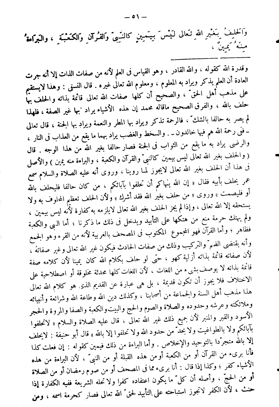 وَإِذَا لَمْ يَجُزِ الْحَلِفُ بِغَيْرِ اللَّهِ تَعَالَى لَا يَلْزَمُهُ بِهِ كَفَارَّةٌ لِأَنَّهُ لَيْسَ بِيَمِينٍ، وَلَمْ يَهْتِكْ حُرْمَةً مُنِعَ مِنْ هَتْكِهَا عَلَى التَّأْبِيدِ، وَيَدْخُلُ فِي ذَلِكَ مَا ذَكَرْنَا، أَمَّا النَّبِيُّ وَالْكَعْبَةُ فَظَاهِرٌ، وَأَمَّا الْقُرْآنُ فَهُوَ الْمَجْمُوعُ الْمَكْتُوبُ فِي الْمُصْحَفِ بِالْعَرَبِيَّةِ لِأَنَّهُ مِنَ الْقَرْءِ وَهُوَ الْجَمْعُ، وَأَنَّهُ يَقْتَضِي الضَّمَّ وَالتَّرْكِيبَ وَذَلِكَ مِنْ صِفَاتِ الْحَادِثِ فَيَكُونُ غَيْرَ اللَّهِ تَعَالَى وَغَيْرَ صِفَاتِهِ، لِأَنَّ صِفَاتِهِ قَائِمَةٌ بِذَاتِهِ أَزَلِيَّةٌ كَهُوَ، حَتَّى لَوْ حَلَفَ بِكَلَامِ اللَّهِ كَانَ يَمِينًا لِأَنَّ كَلَامَهُ صِفَةٌ قَائِمَةٌ بِذَاتِهِ لَا يُوصَفُ بِشَيْءٍ مِنَ اللُّغَاتِ، لِأَنَّ اللُّغَاتِ كُلَّهَا مُحْدَثَةٌ مَخْلُوقَةٌ أَوِ اصْطِلَاحِيَّةٌ عَلَى الِاخْتِلَافِ فَلَا يَجُوزُ أَنْ تَكُونَ قَدِيمَةً، بَلْ هِيَ عِبَارَةً عَنِ الْقَدِيمِ الَّذِي هُوَ كَلَامُ اللَّهِ تَعَالَى. هَذَا مَذْهَبُ أَهْلِ السُّنَّةِ وَالْجَمَاعَةِ مِنْ أَصْحَابِنَا، وَكَذَلِكَ دِينُ اللَّهِ وَطَاعَةُ اللَّهِ وَشَرَائِعُهُ وَأَنْبِيَاؤُهُ وَمَلَائِكَتُهُ وَعَرْشُهُ وَحُدُودُهُ وَالصَّلَاةُ وَالصَّوْمُ وَالْحَجُّ وَالْبَيْتُ وَالْكَعْبَةُ وَالصَّفَا وَالْمَرْوَةُ وَالْحَجَرُ الْأَسْوَدُ وَالْقَبْرُ وَالْمِنْبَرُ لِأَنَّ جَمِيعَ ذَلِكَ غَيْرُ اللَّهِ تَعَالَى، قَالَ - عَلَيْهِ الصَّلَاةُ وَالسَّلَامُ -: «لَا تَحْلِفُوا بِآبَائِكُمْ وَلَا بِالطَّوَاغِيتِ وَلَا بِحَدٍّ مِنْ حُدُودِ اللَّهِ وَلَا تَحْلِفُوا إِلَّا بِاللَّهِ» قَالَ أَبُو حَنِيفَةَ: لَا يَحْلِفُ إِلَّا بِاللَّهِ مُتَجَرِّدًا بِالتَّوْحِيدِ وَالْإِخْلَاصِ. وَأَمَّا الْبَرَاءَةُ مِنْ ذَلِكَ فَيَمِينٌ كَقَوْلِهِ: إِنْ فَعَلْتُ كَذَا فَأَنَا بَرِيءٌ مِنَ الْقُرْآنِ أَوْ مِنَ الْكَعْبَةِ أَوْ مِنْ هَذِهِ الْقِبْلَةِ أَوْ مِنَ النَّبِيِّ، لِأَنَّ الْبَرَاءَةَ مِنْ هَذِهِ الْأَشْيَاءِ كُفْرٌ، وَكَذَا إِذَا قَالَ: أَنَا بَرِيءٌ مِمَّا فِي الْمُصْحَفِ أَوْ مِنْ صَوْمِ رَمَضَانَ أَوْ مِنَ الصَّلَاةِ أَوْ مِنَ الْحَجِّ، وَأَصْلُهُ أَنَّ كُلَّ مَا يَكُونُ اعْتِقَادُهُ كُفْرًا وَلَا تُحِلُّهُ الشَّرِيعَةُ فَفِيهِ الْكَفَّارَةُ إِذَا حَنِثَ، لِأَنَّ الْكُفْرَ لَا تَجُوزُ اسْتِبَاحَتُهُ عَلَى التَّأْبِيدِ لِحَقِّ اللَّهِ تَعَالَى فَصَارَ كَحُرْمَةِ اسْمِهِ، وَمِنْ