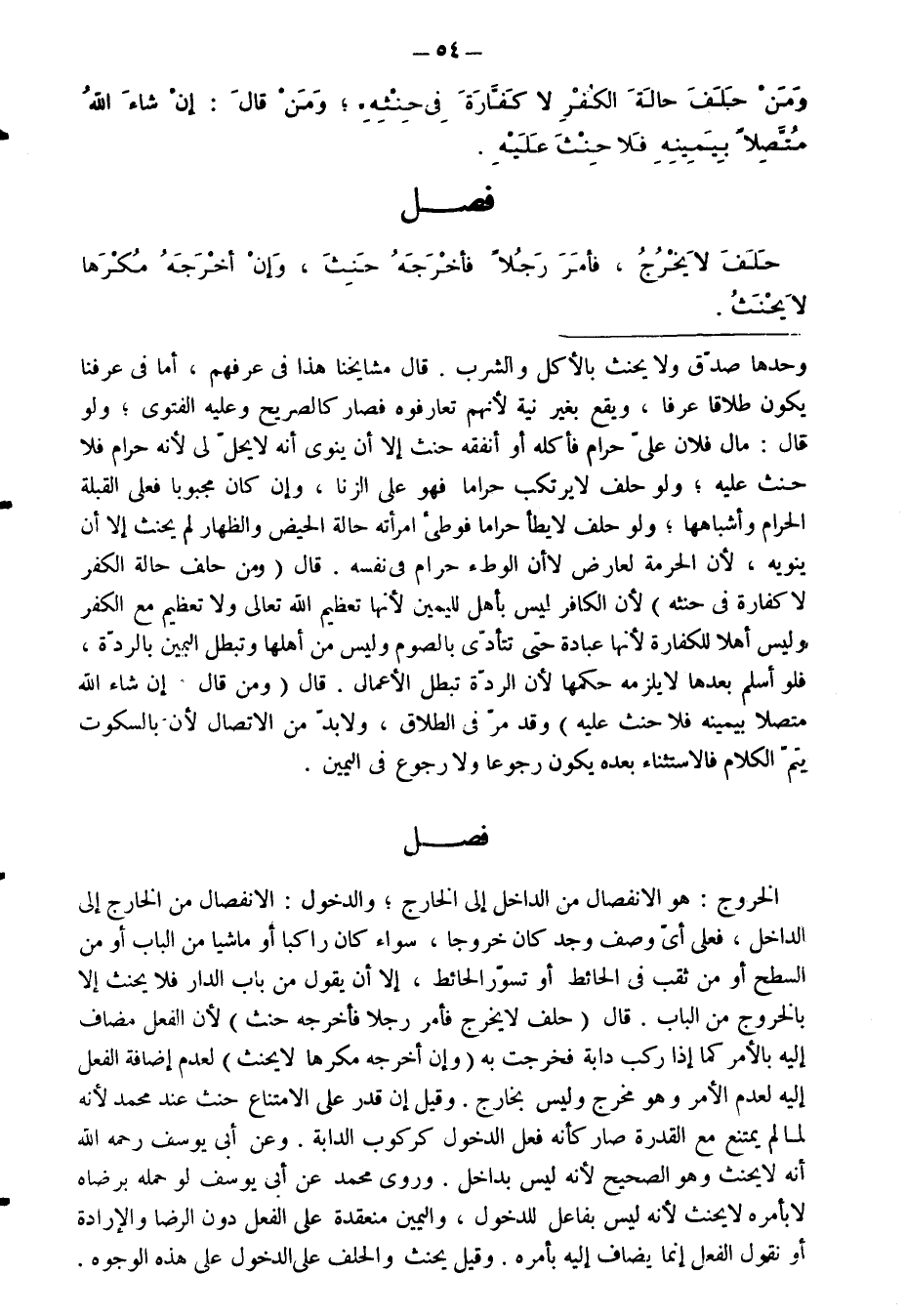 فَصْلٌ الْخُرُوجُ: هُوَ الِانْفِصَالُ مِنَ الدَّاخِلِ إِلَى الْخَارِجِ، وَالدُّخُولُ: الِانْفِصَالُ مِنَ الْخَارِجِ إِلَى الدَّاخِلِ، فَعَلَى أَيِّ وَصْفٍ وُجِدَ كَانَ خُرُوجًا، سَوَاءٌ كَانَ رَاكِبًا أَوْ مَاشِيًا مِنَ الْبَابِ أَوْ مِنَ السَّطْحِ أَوْ مِنْ ثُقْبٍ فِي الْحَائِطِ أَوْ تَسَوَّرَ الْحَائِطَ، إِلَّا أَنْ يَقُولَ مِنْ بَابِ الدَّارِ، فَلَا يَحْنَثُ إِلَّا بِالْخُرُوجِ مِنَ الْبَابِ.